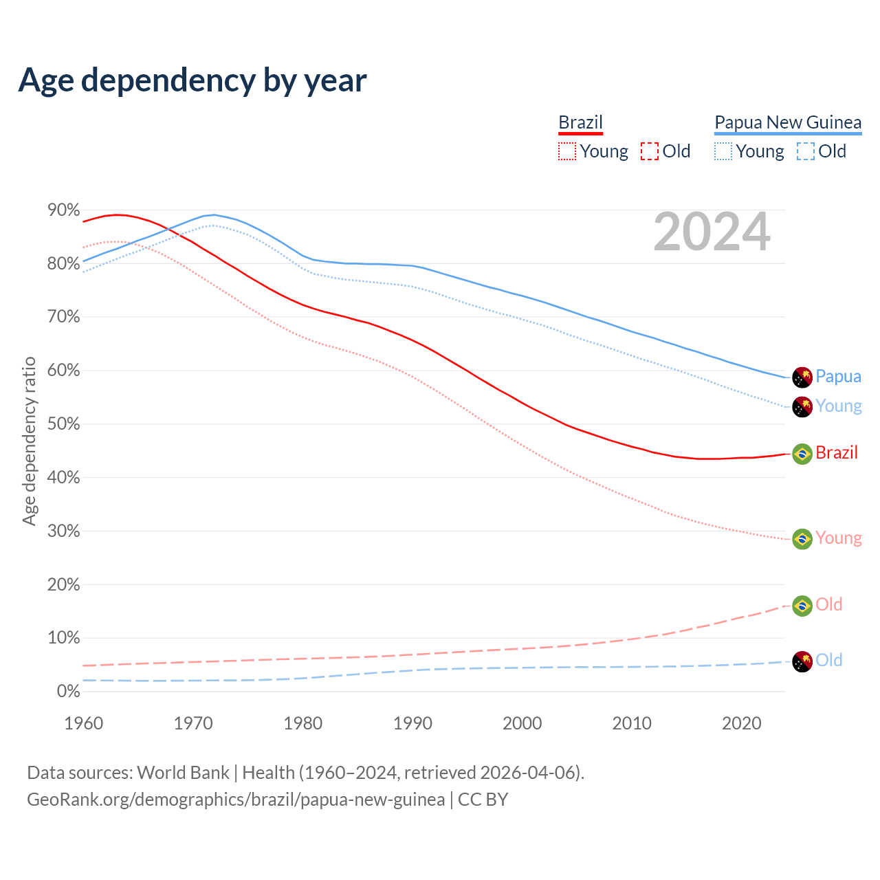 The share of older people aged 65 and over is 11% in Brazil and 3.46% in Papua New Guinea. Life expectancy in Brazil compared to Papua New Guinea .