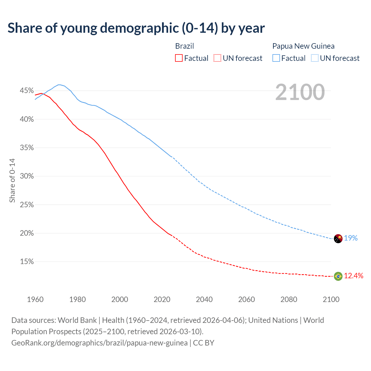 - The share of young demographic (0-15 years old) in Brazil is 19.7% vs 33.5% in Papua New Guinea.