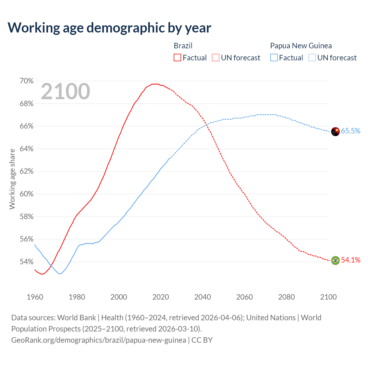 Median age Brazil vs Papua New Guinea, 1960-2100