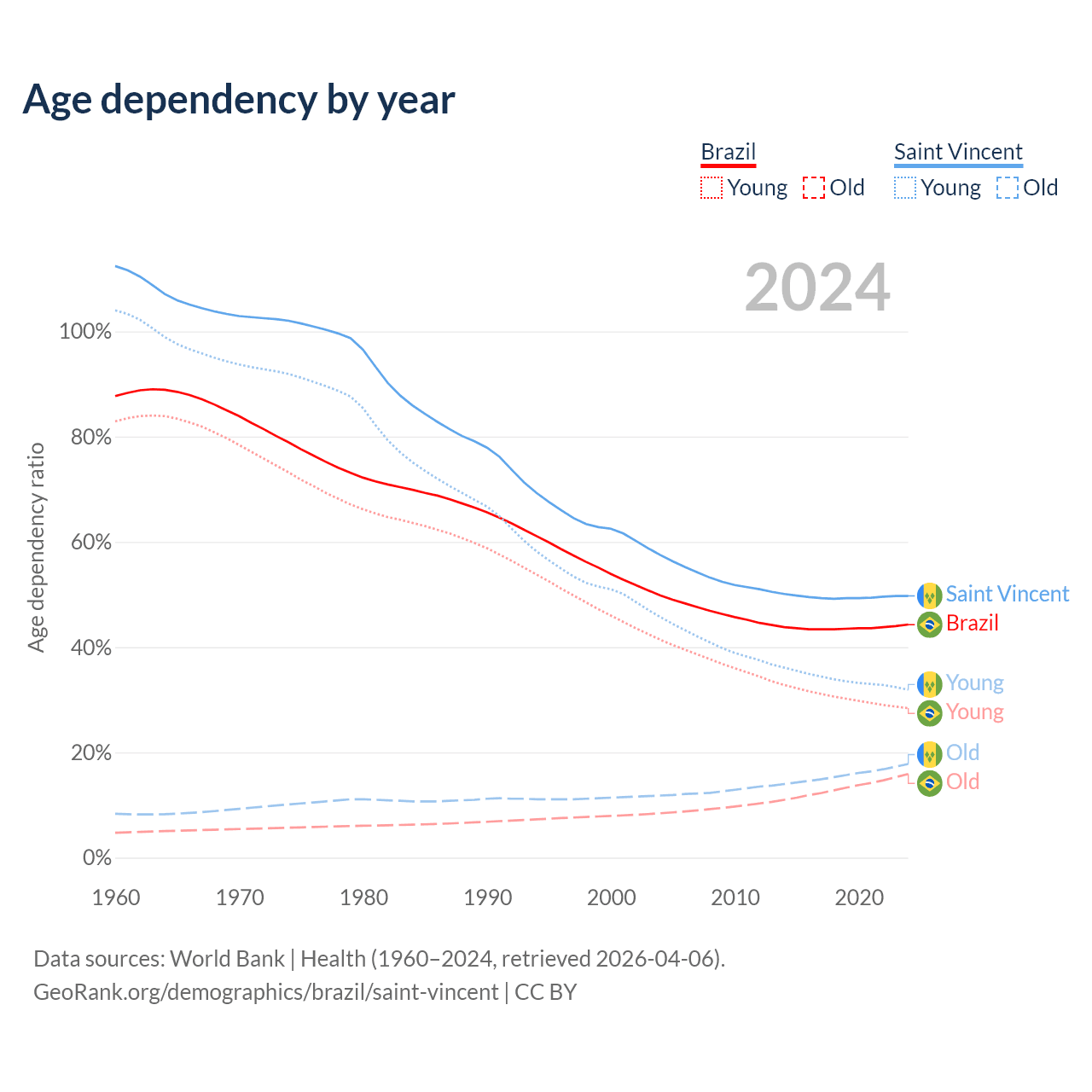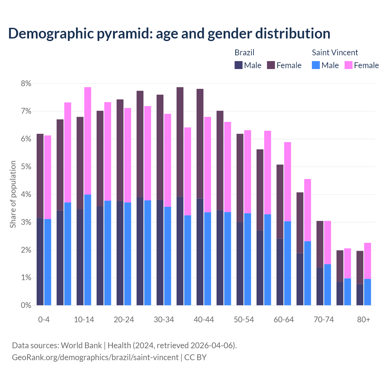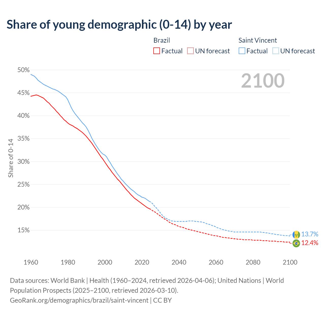 - The share of young demographic (0-15 years old) in Brazil is 19.7% vs 21.3% in Saint Vincent.
