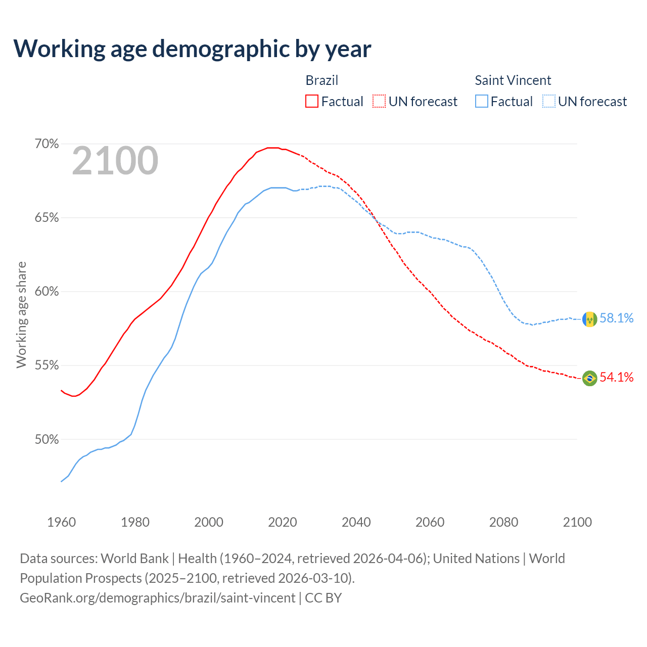 Median age Brazil vs Saint Vincent, 1960-2100