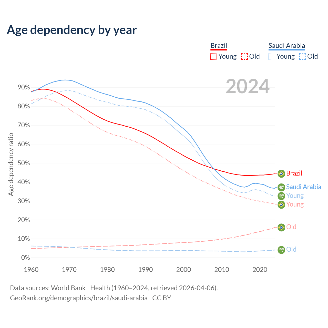 The share of older people aged 65 and over is 11% in Brazil and 2.95% in Saudi Arabia. Life expectancy in Brazil compared to Saudi Arabia .