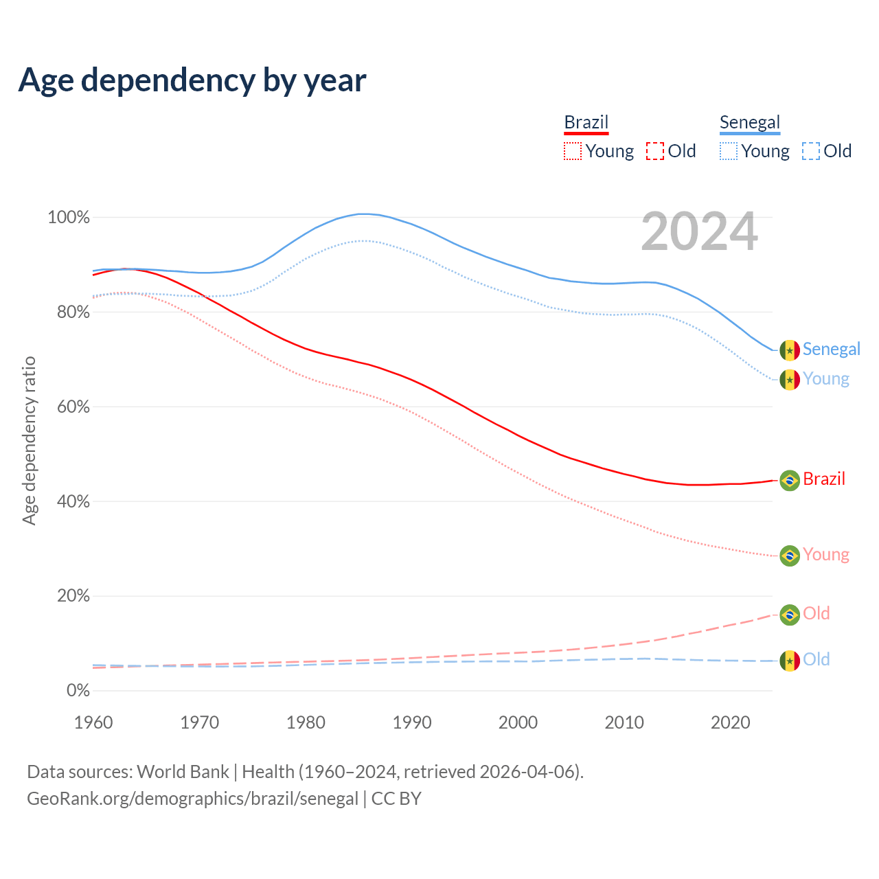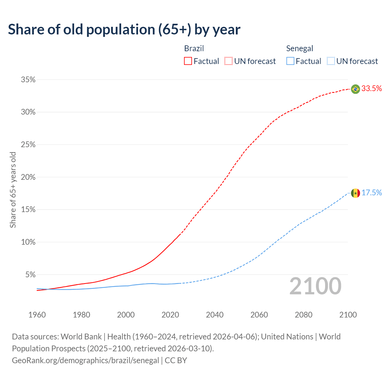The share of older people aged 65 and over is 11% in Brazil and 3.62% in Senegal. Life expectancy in Brazil compared to Senegal .
