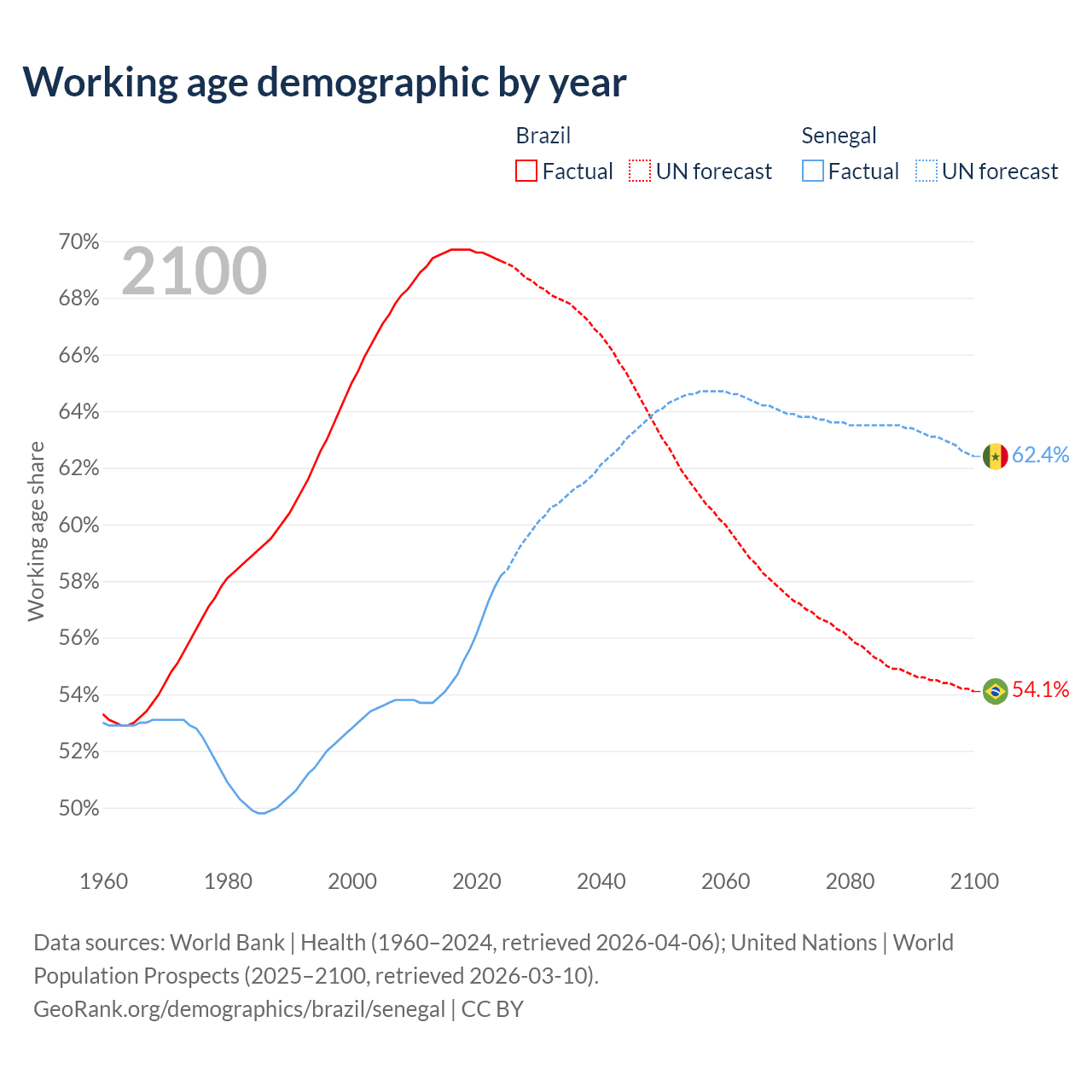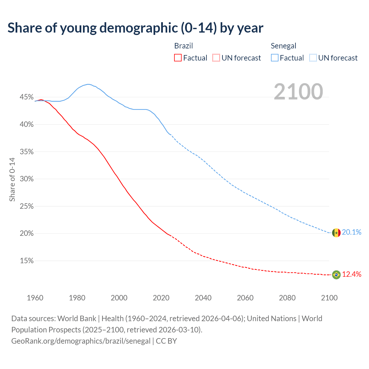 - As of 2026, the population of Brazil is 214M vs 19.5M in Senegal - 11 times difference.