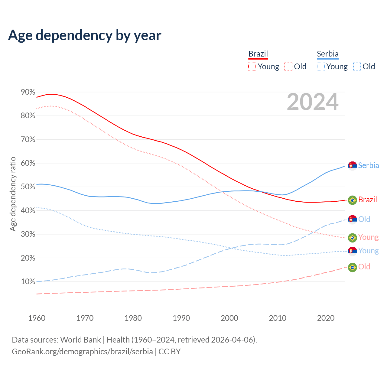 - Brazil is ranked 73/196 by median age (oldest to youngest) vs 15/196 for Serbia.