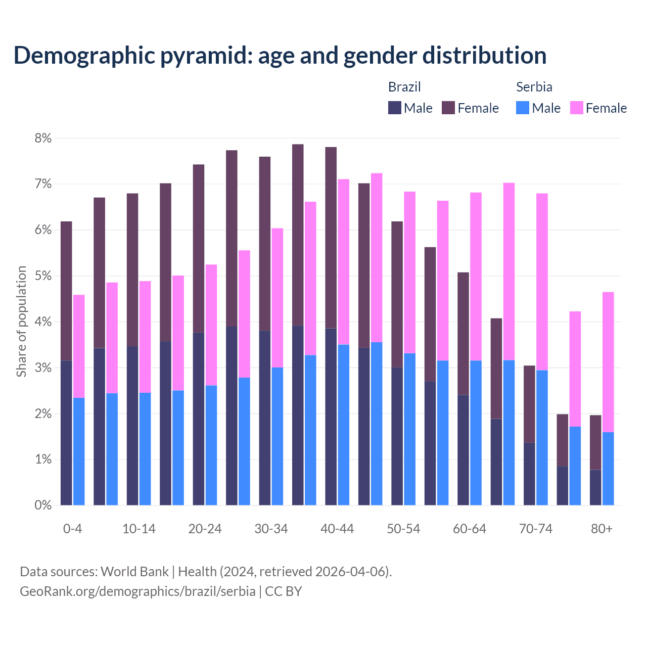 The share of older people aged 65 and over is 11% in Brazil and 22.7% in Serbia. Life expectancy in Brazil compared to Serbia .