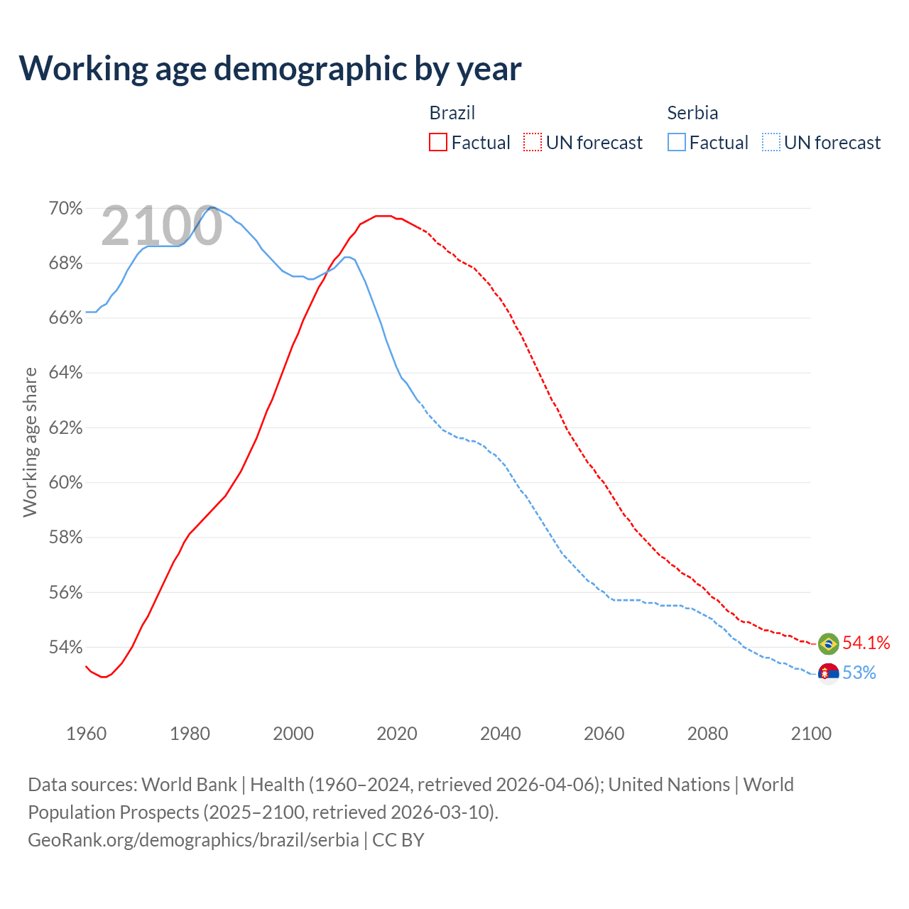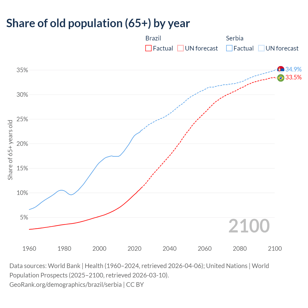 Median age Brazil vs Serbia, 1960-2100