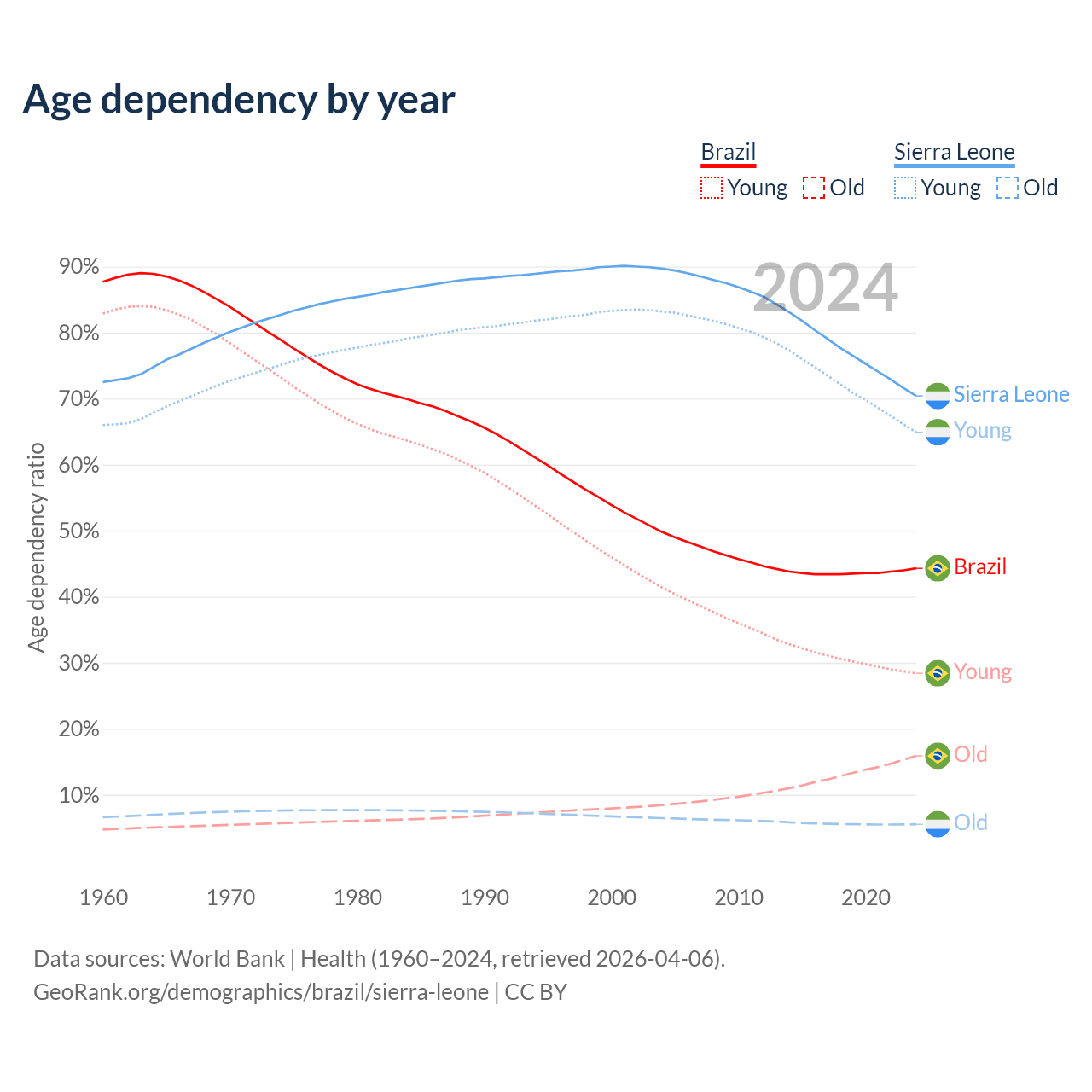 The share of older people aged 65 and over is 11% in Brazil and 3.24% in Sierra Leone. Life expectancy in Brazil compared to Sierra Leone .
