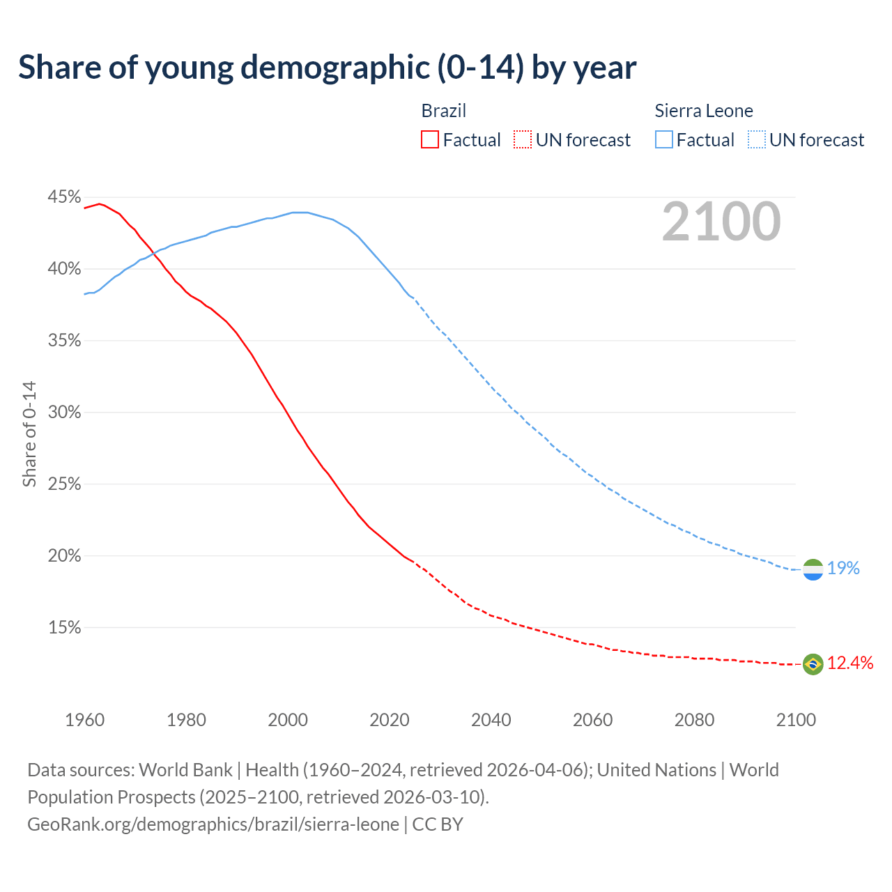 - The share of young demographic (0-15 years old) in Brazil is 19.7% vs 38.1% in Sierra Leone.
