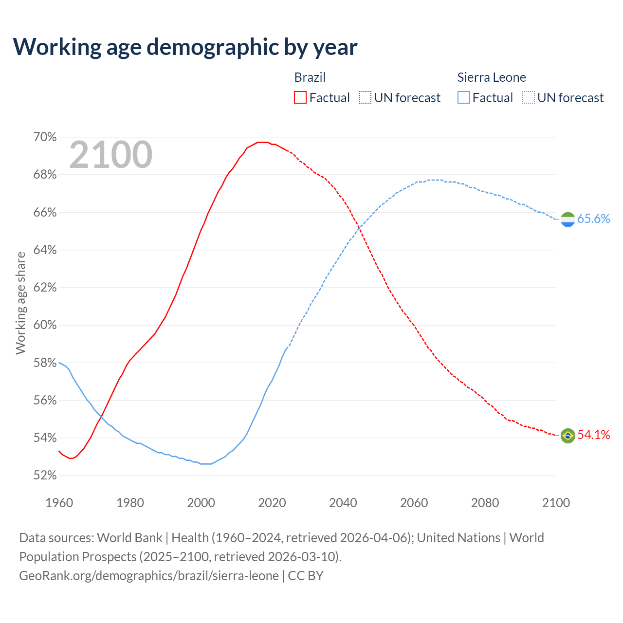 - Brazil has 148M working age adults (aged 15-64) vs 5.31M in Sierra Leone.