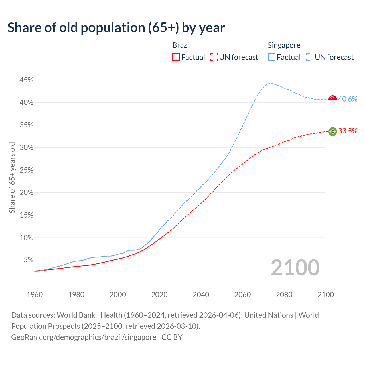 Median age Brazil vs Singapore, 1960-2100