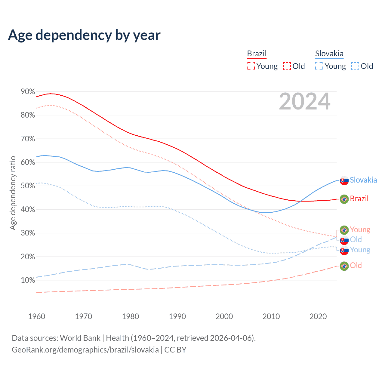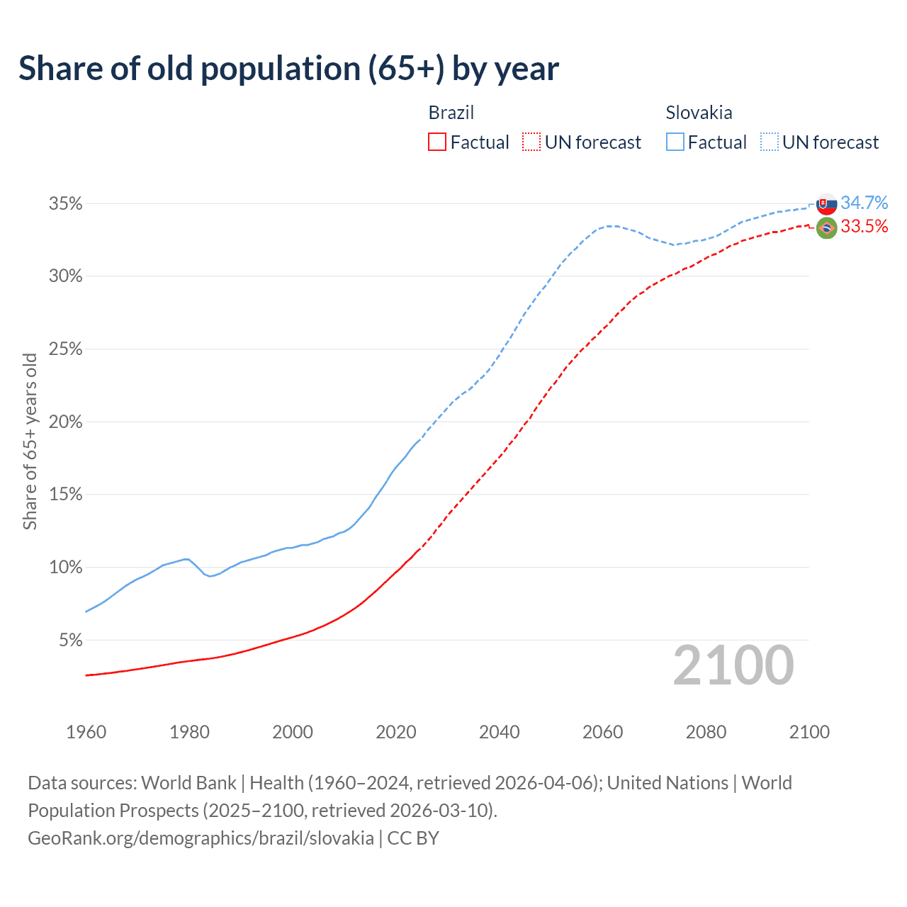 The share of older people aged 65 and over is 11% in Brazil and 18.5% in Slovakia. Life expectancy in Brazil compared to Slovakia .