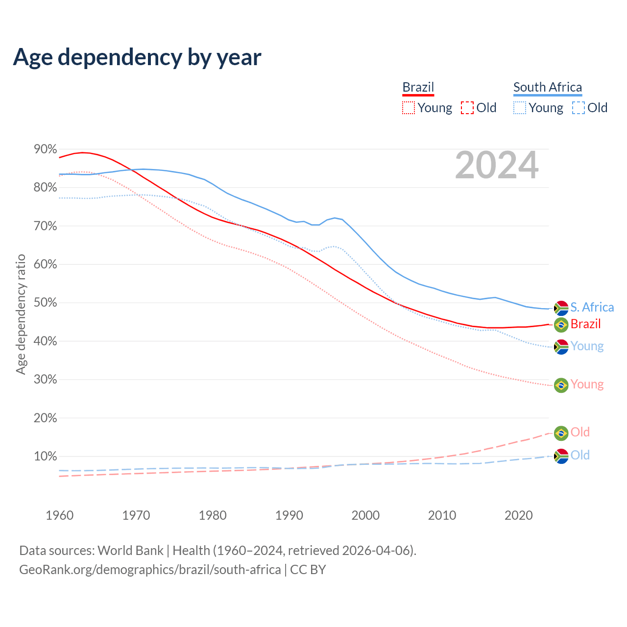- Brazil is ranked 73/196 by median age (oldest to youngest) vs 107/196 for South Africa.