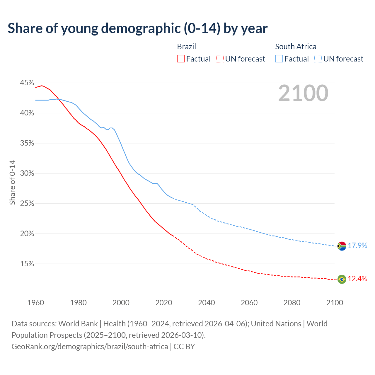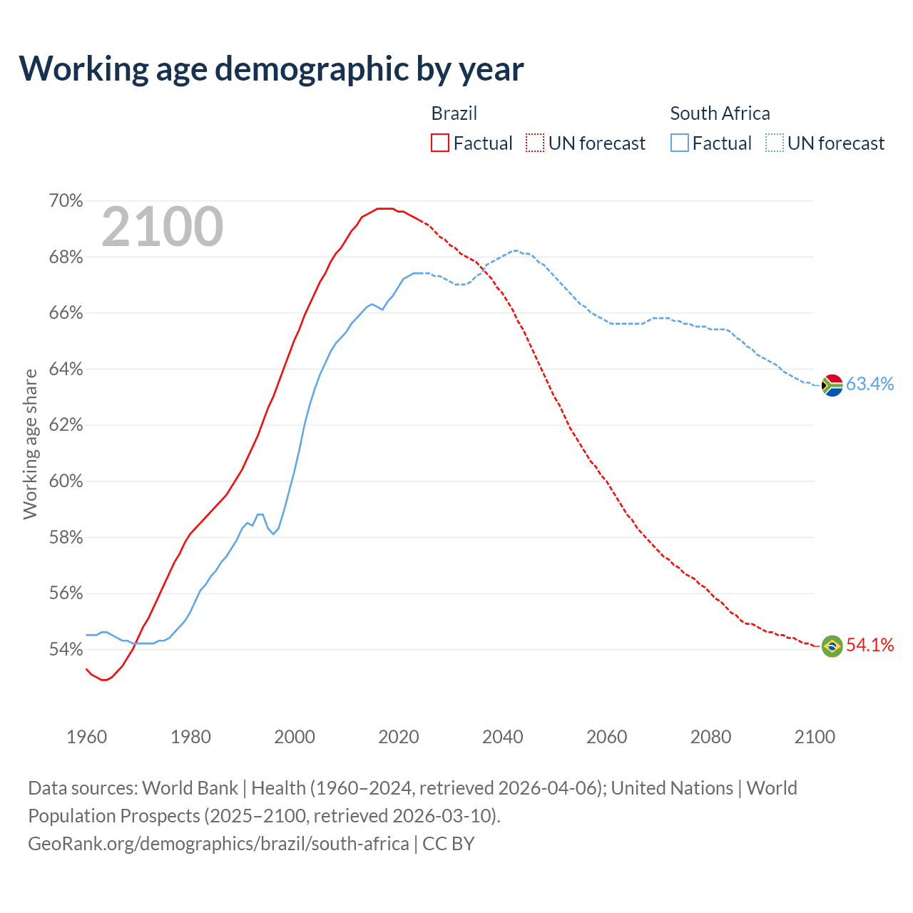 Median age Brazil vs South Africa, 1960-2100