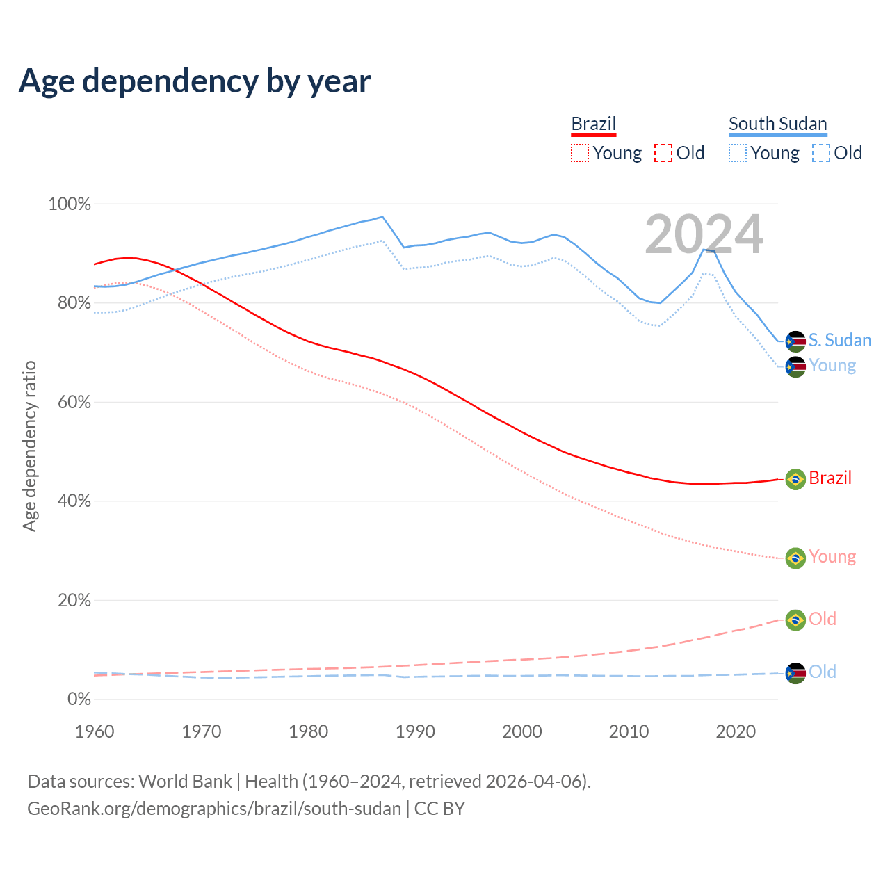- The share of old-age demographic (65+) in Brazil is 11% vs 2.99% in South Sudan.