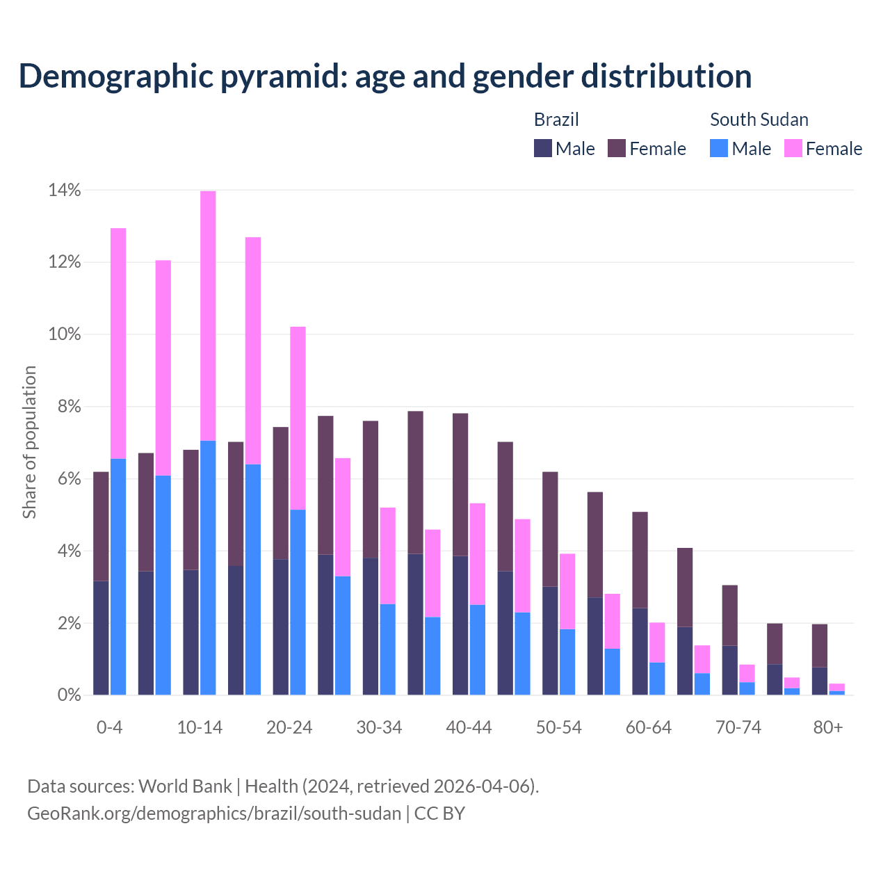 - As of 2026, the population of Brazil is 214M vs 12.5M in South Sudan - 17.1 times difference.
