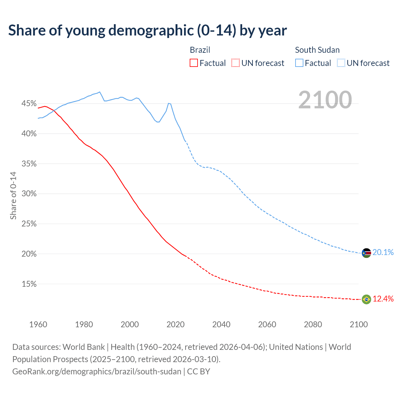 - The share of young demographic (0-15 years old) in Brazil is 19.7% vs 38.9% in South Sudan.