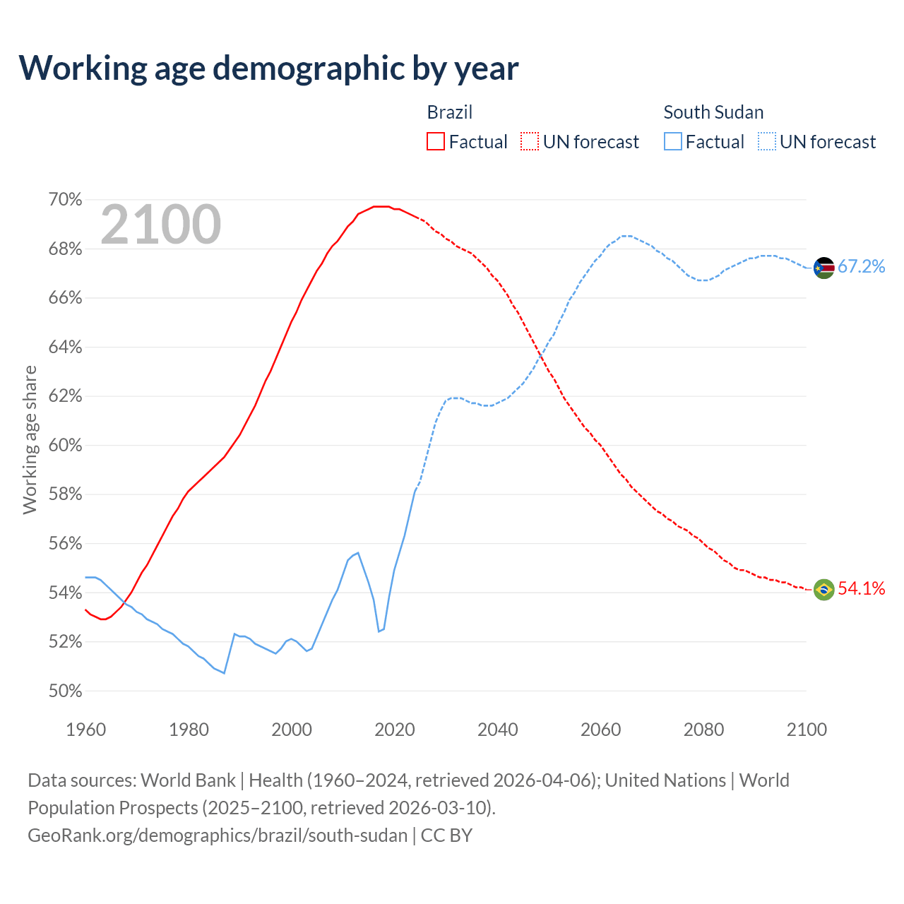 - Brazil has 148M working age adults (aged 15-64) vs 7.27M in South Sudan.