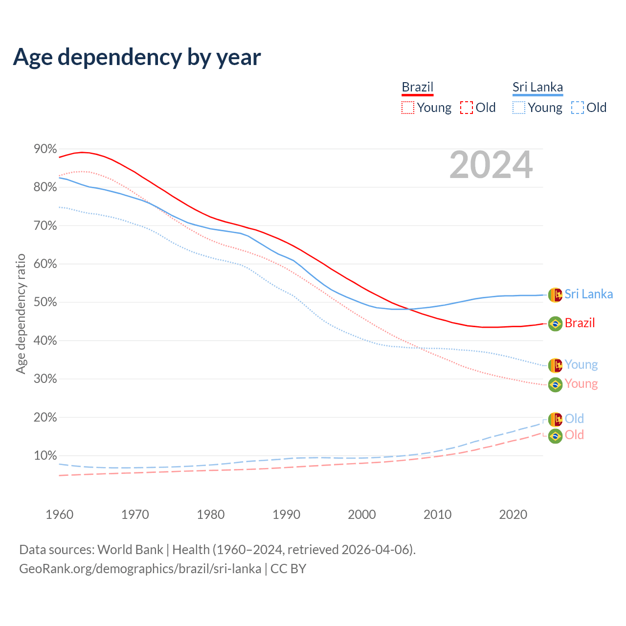 The share of older people aged 65 and over is 11% in Brazil and 12.1% in Sri Lanka. Life expectancy in Brazil compared to Sri Lanka .