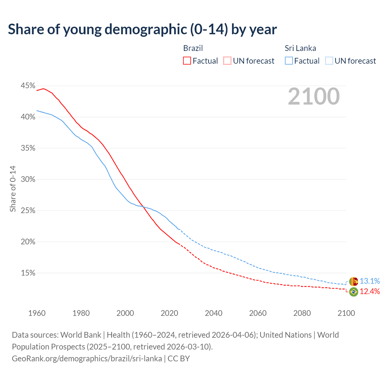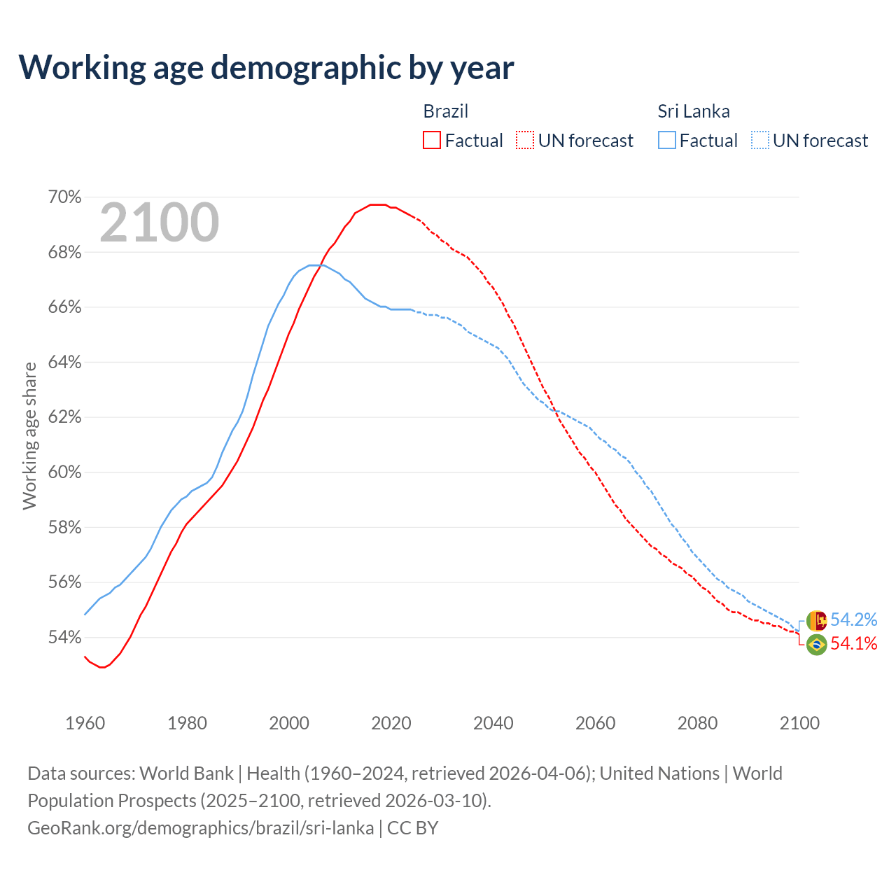 Median age Brazil vs Sri Lanka, 1960-2100