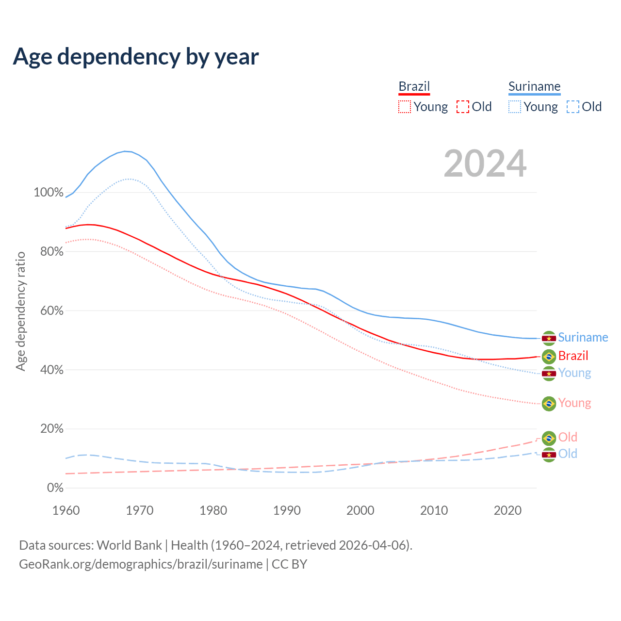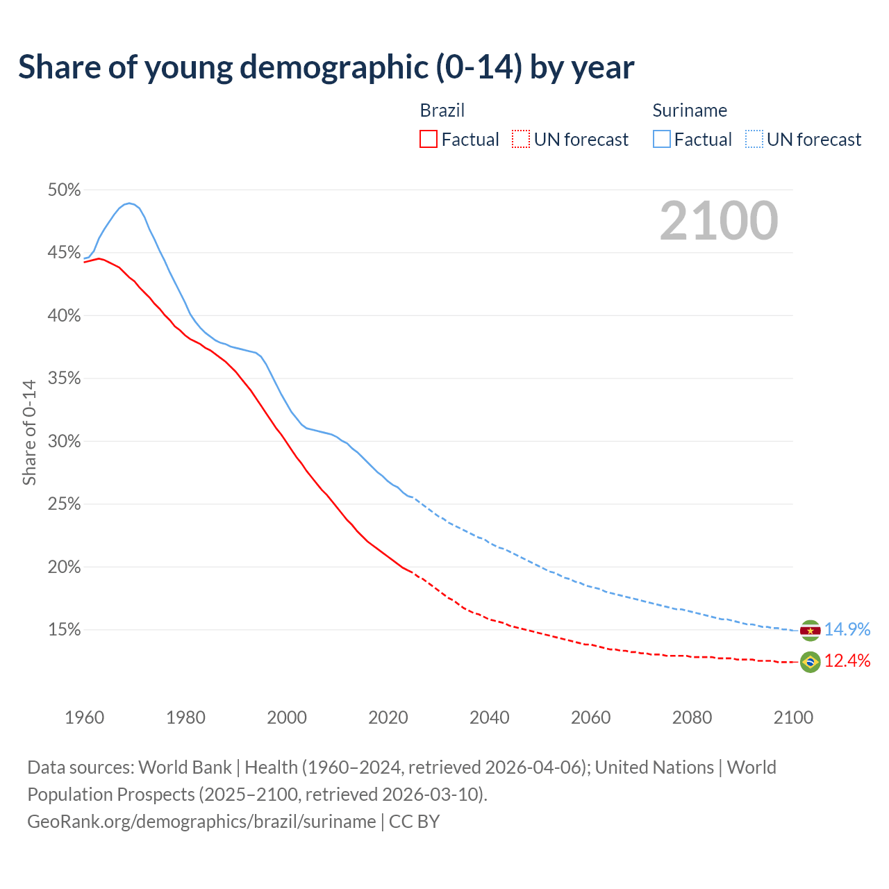 - The share of young demographic (0-15 years old) in Brazil is 19.7% vs 25.6% in Suriname.