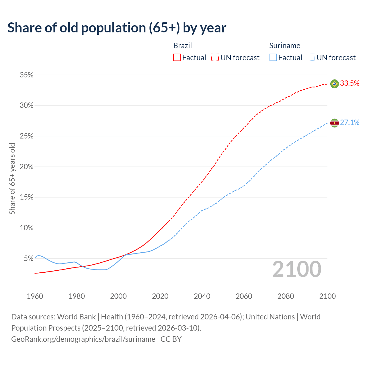 The share of older people aged 65 and over is 11% in Brazil and 7.9% in Suriname. Life expectancy in Brazil compared to Suriname .