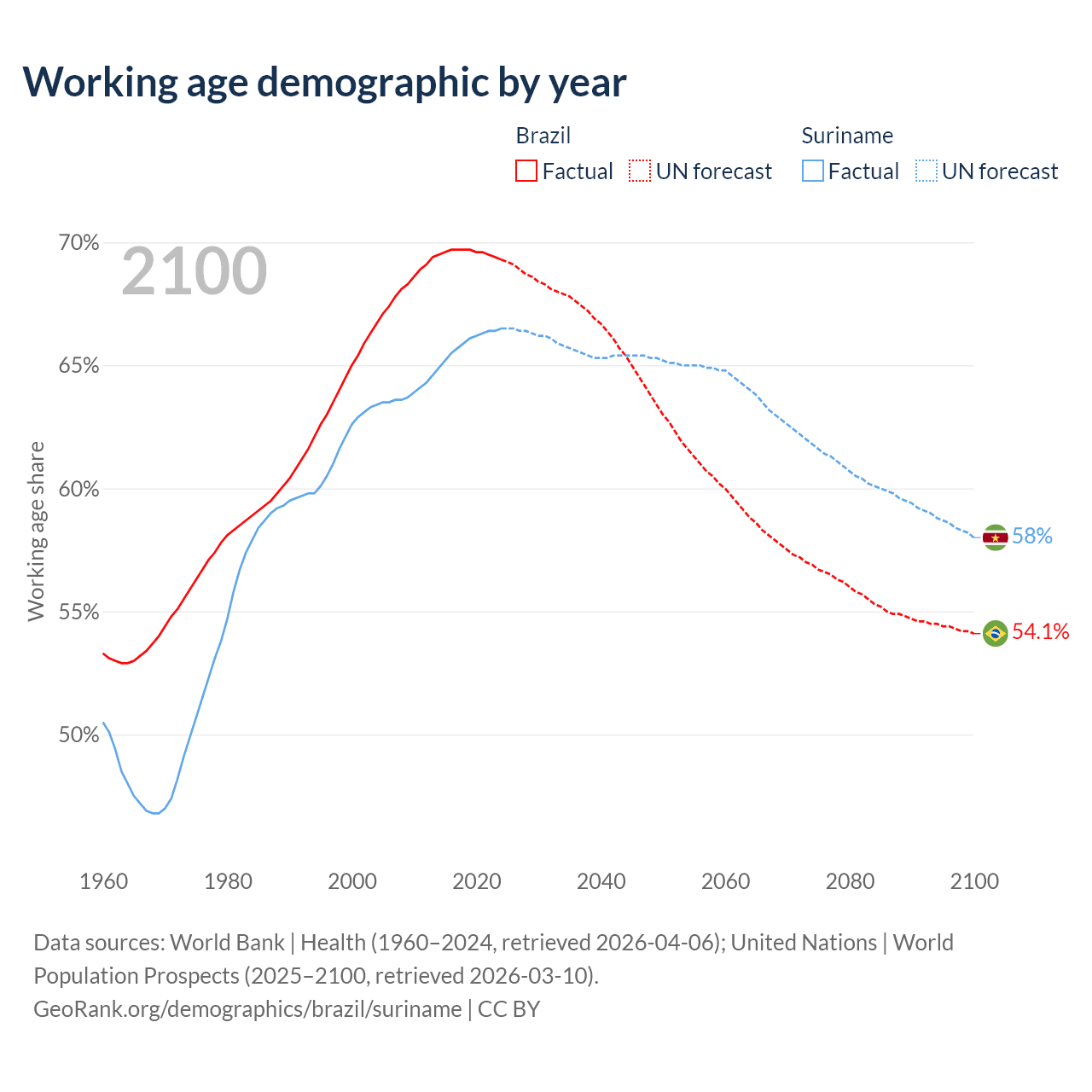 Median age Brazil vs Suriname, 1960-2100