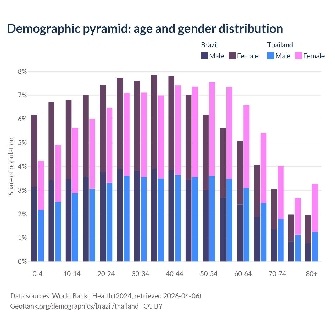 - The median age in Brazil is 35.4 years compared to 41.1 years in Thailand.