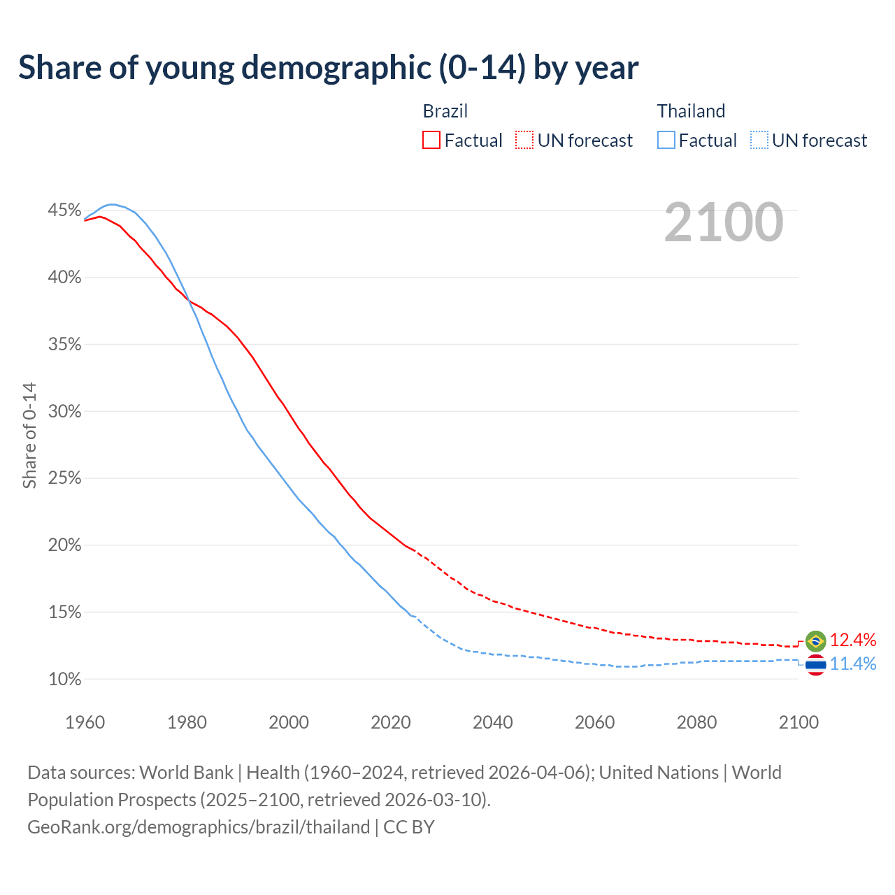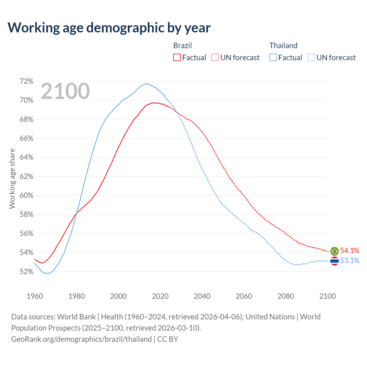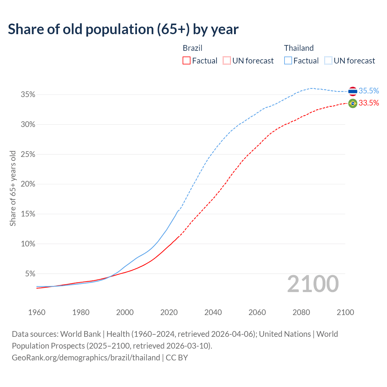 Median age Brazil vs Thailand, 1960-2100