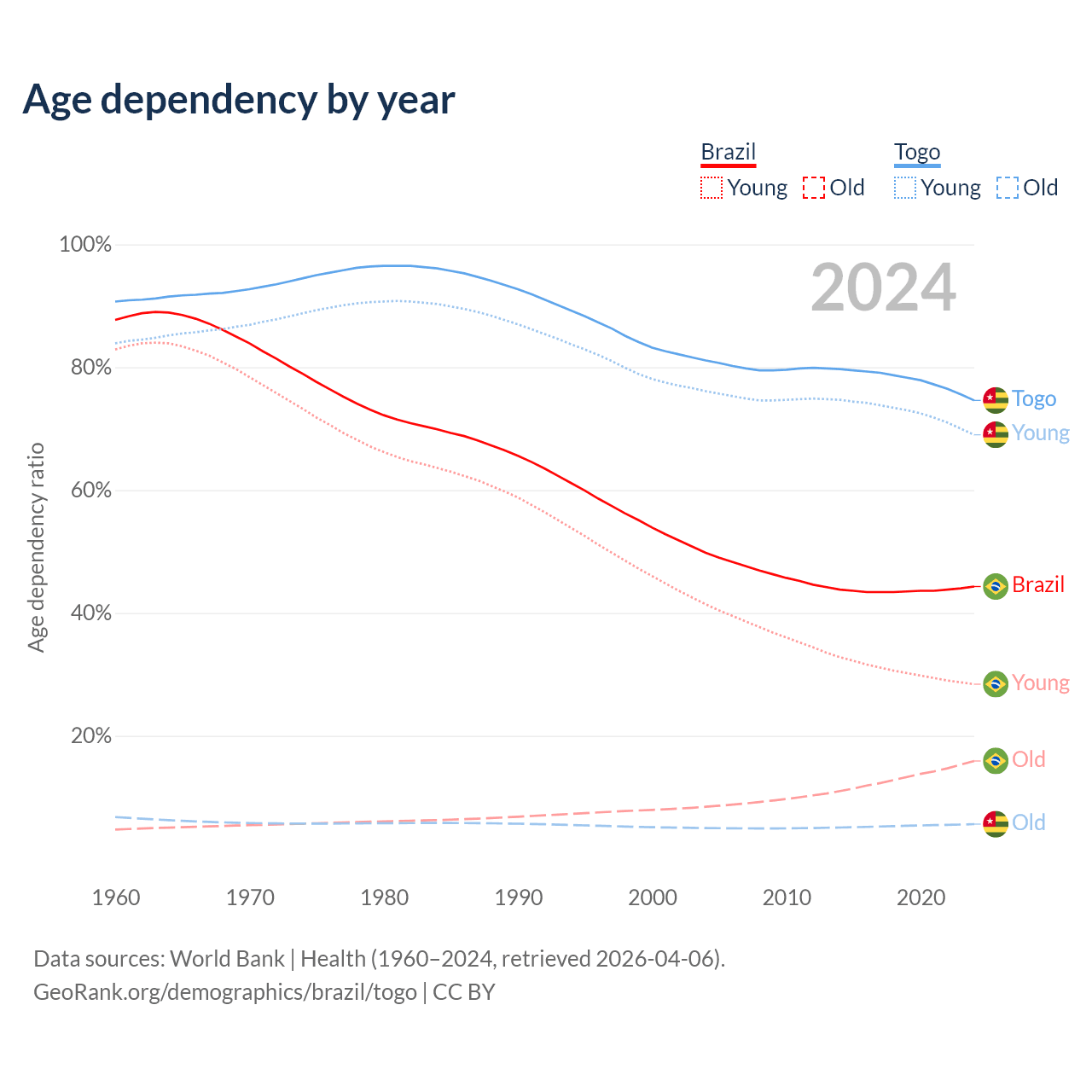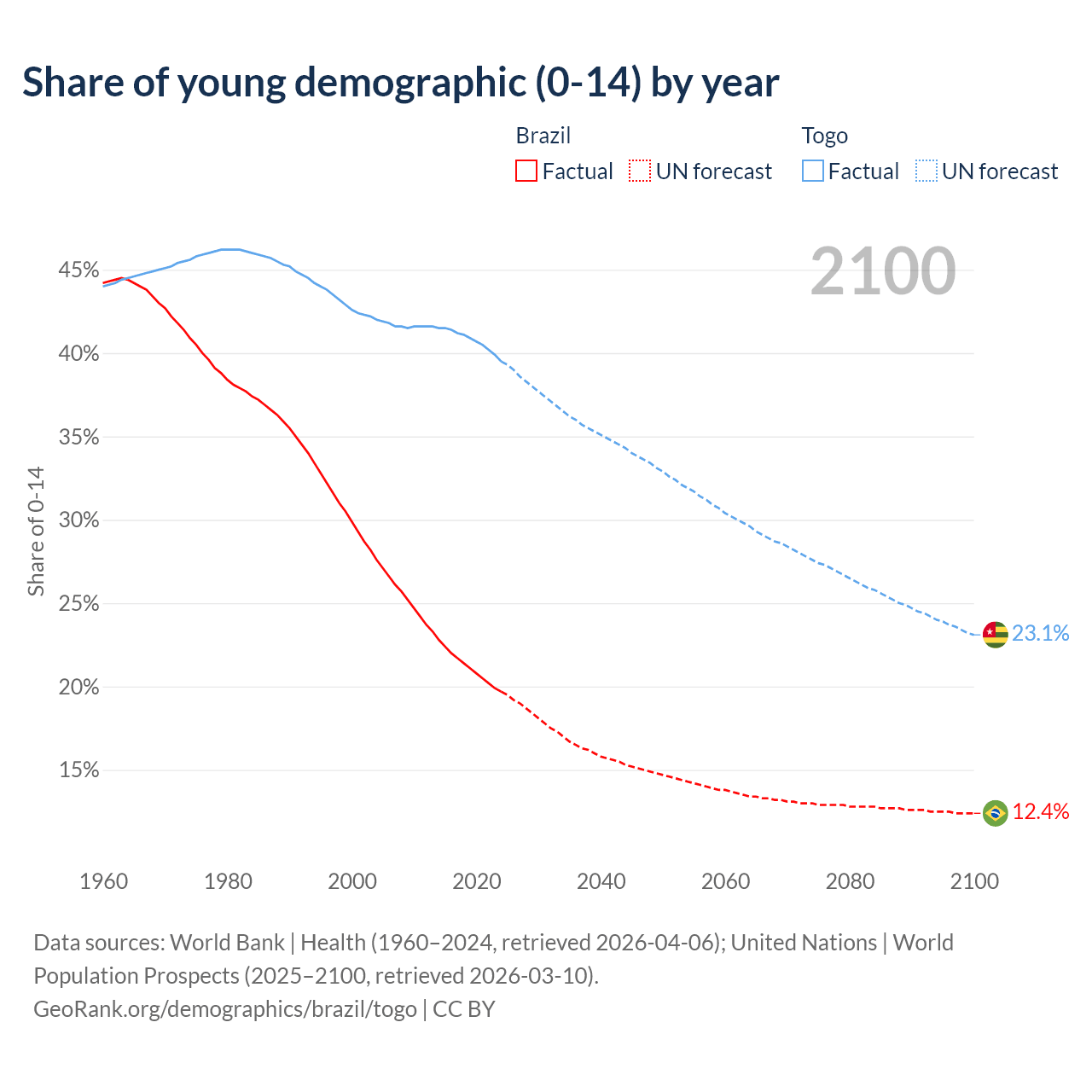 - The share of young demographic (0-15 years old) in Brazil is 19.7% vs 39.5% in Togo.