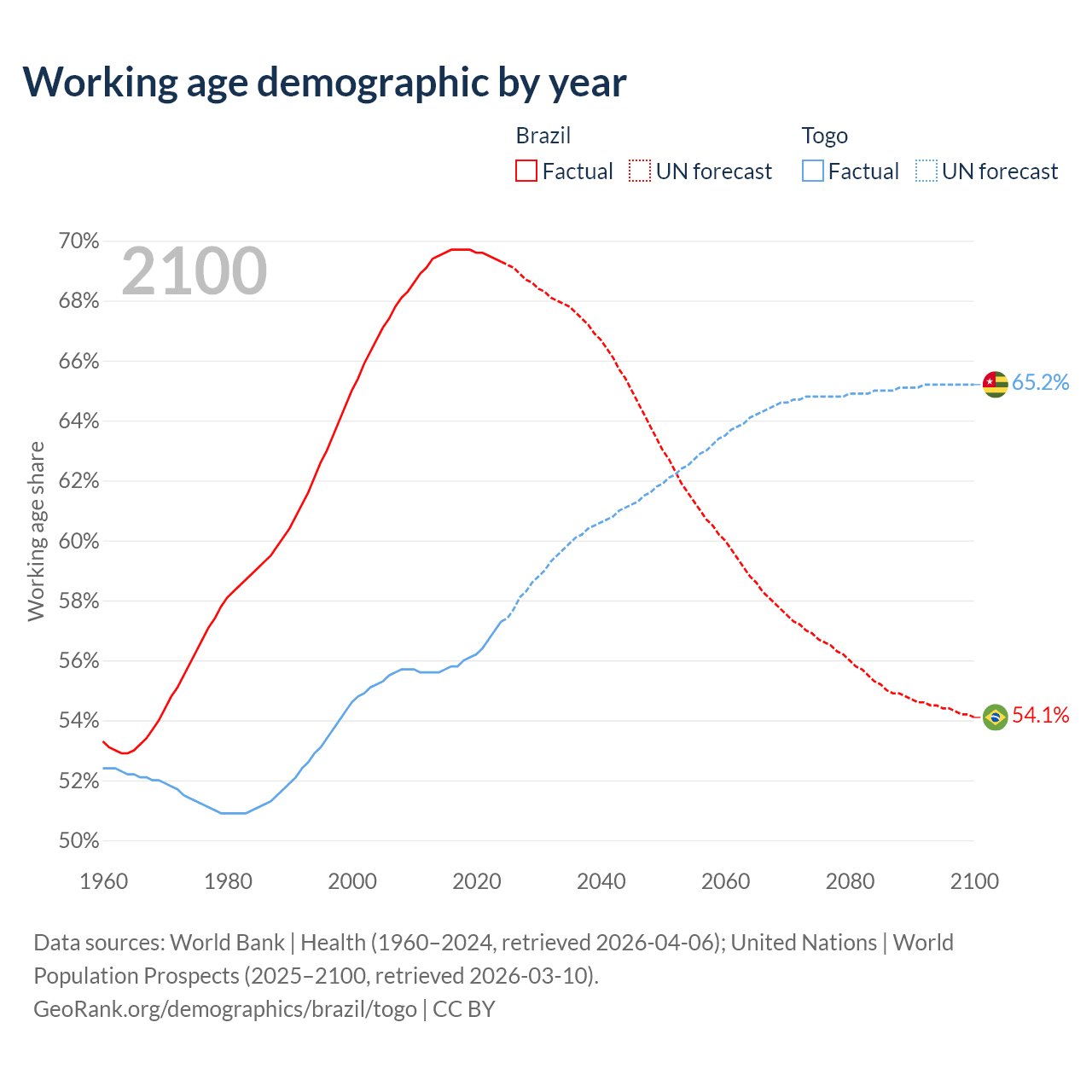 Median age Brazil vs Togo, 1960-2100