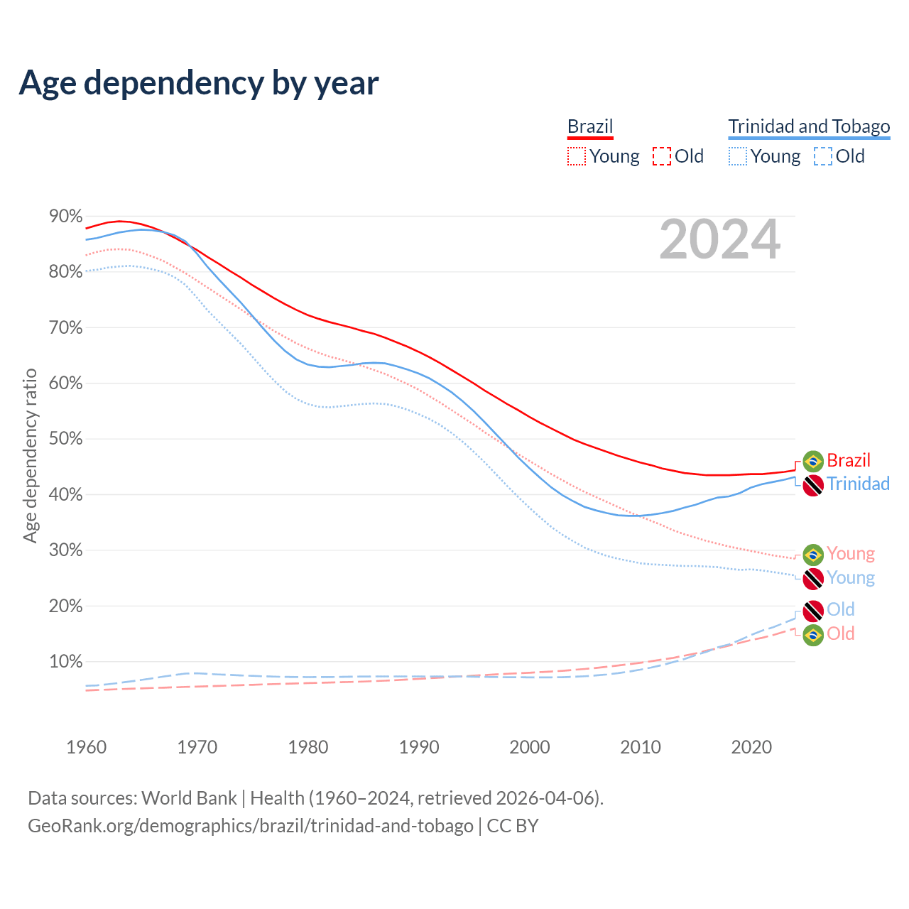 Data sources: World Bank | Health (1960–2024, retrieved 2026-04-06); U.S. Census Bureau (1960–2024, retrieved 2026-02-08).