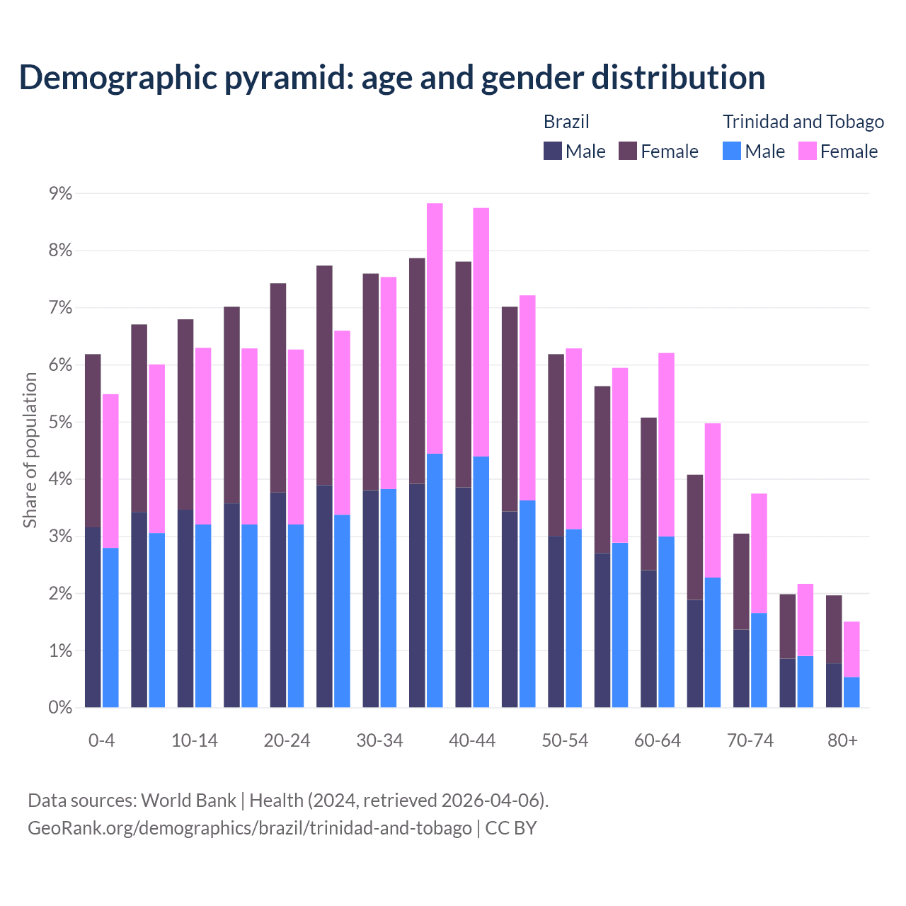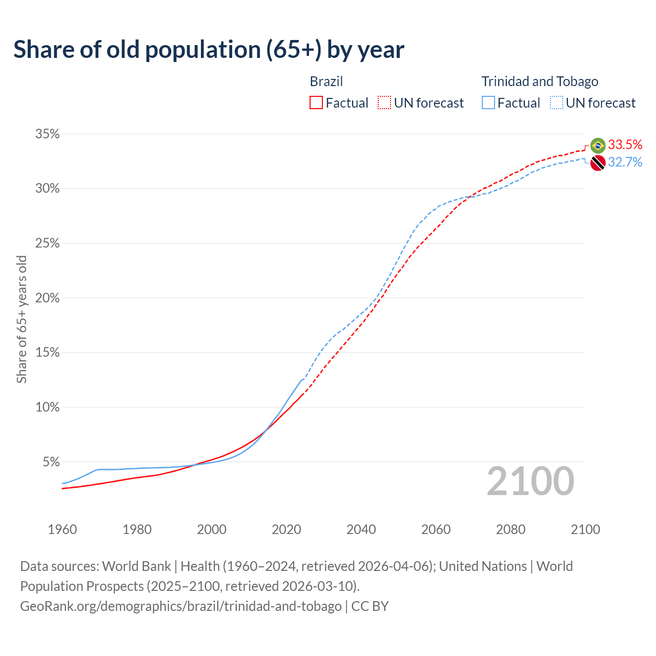 The share of older people aged 65 and over is 11% in Brazil and 12.4% in Trinidad and Tobago. Life expectancy in Brazil compared to Trinidad and Tobago .