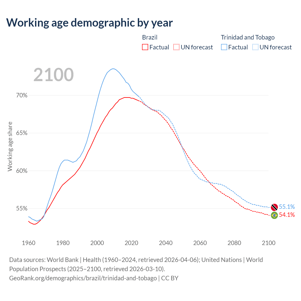 Median age Brazil vs Trinidad and Tobago, 1960-2100