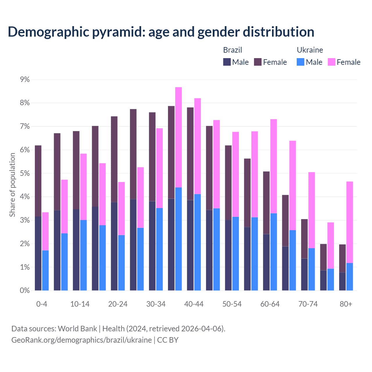 - Brazil is ranked 73/196 by median age (oldest to youngest) vs 26/196 for Ukraine.