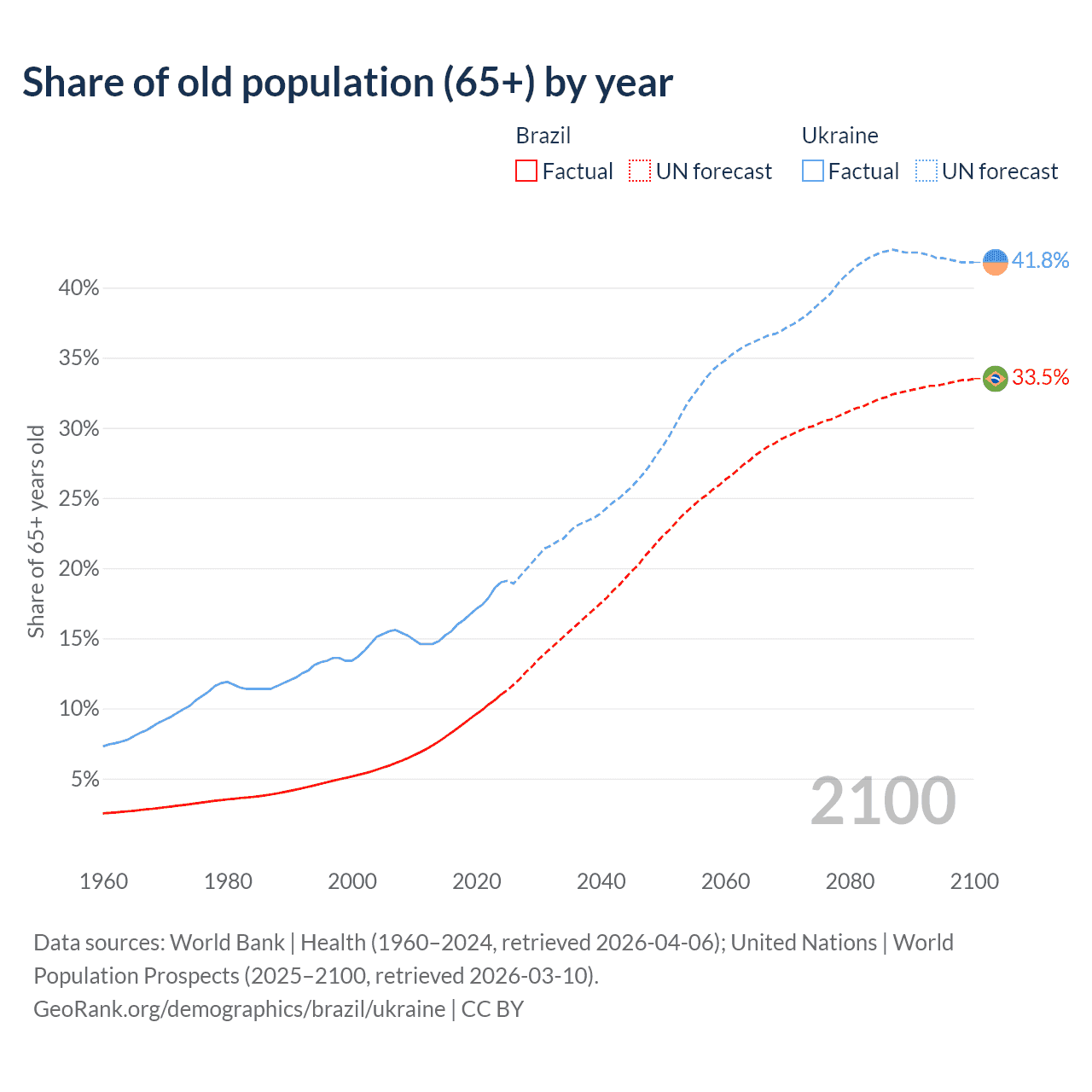 The share of older people aged 65 and over is 11% in Brazil and 19% in Ukraine. Life expectancy in Brazil compared to Ukraine .