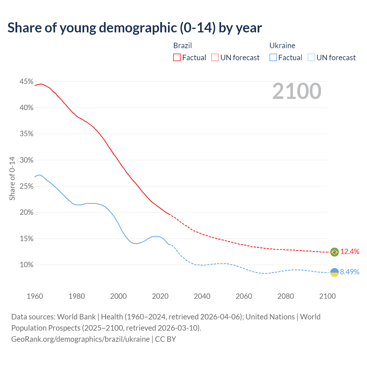 - The total fertility rate is 1.62 in Brazil compared to 0.98 in Ukraine.