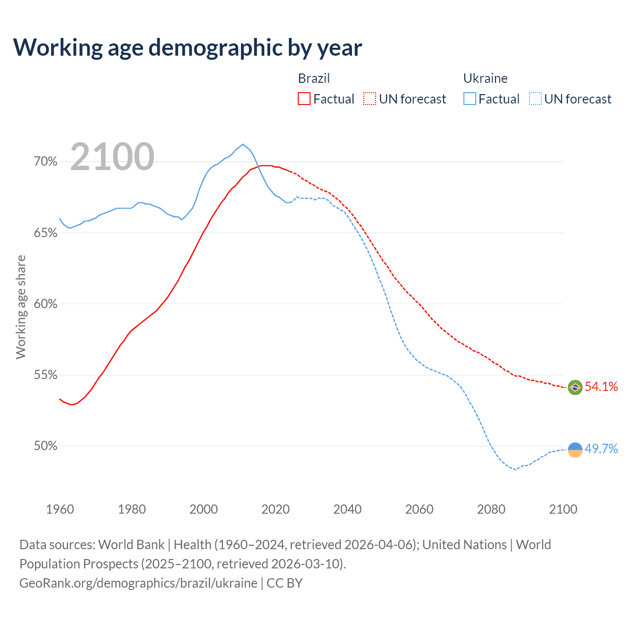 - Brazil has 148M working age adults (aged 15-64) vs 26.9M in Ukraine.