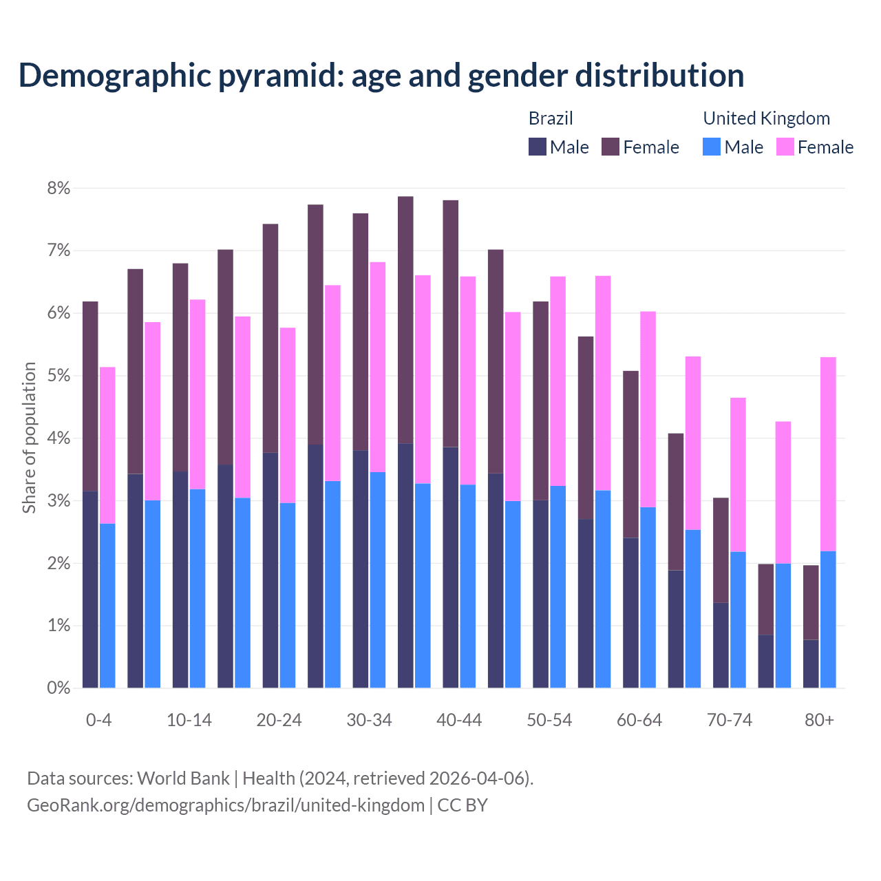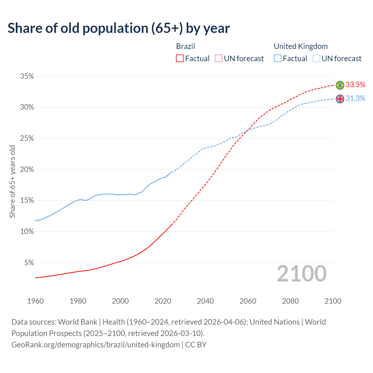 The share of older people aged 65 and over is 11% in Brazil and 19.5% in the United Kingdom. Life expectancy in Brazil compared to the United Kingdom .