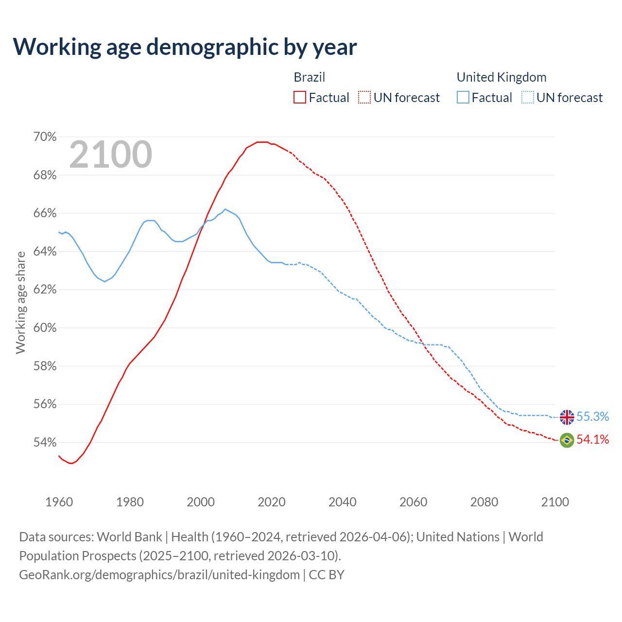 - Brazil has 148M working age adults (aged 15-64) vs 44.4M in the United Kingdom.