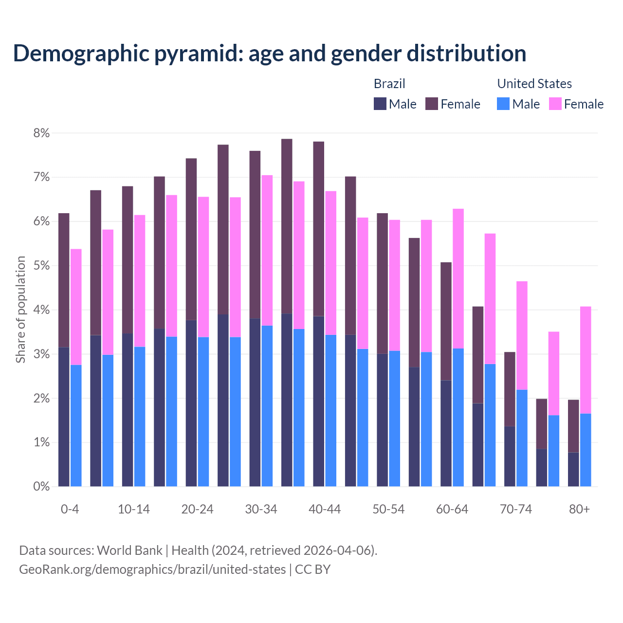 - The median age in Brazil is 35.4 years compared to 39.3 years in the United States.