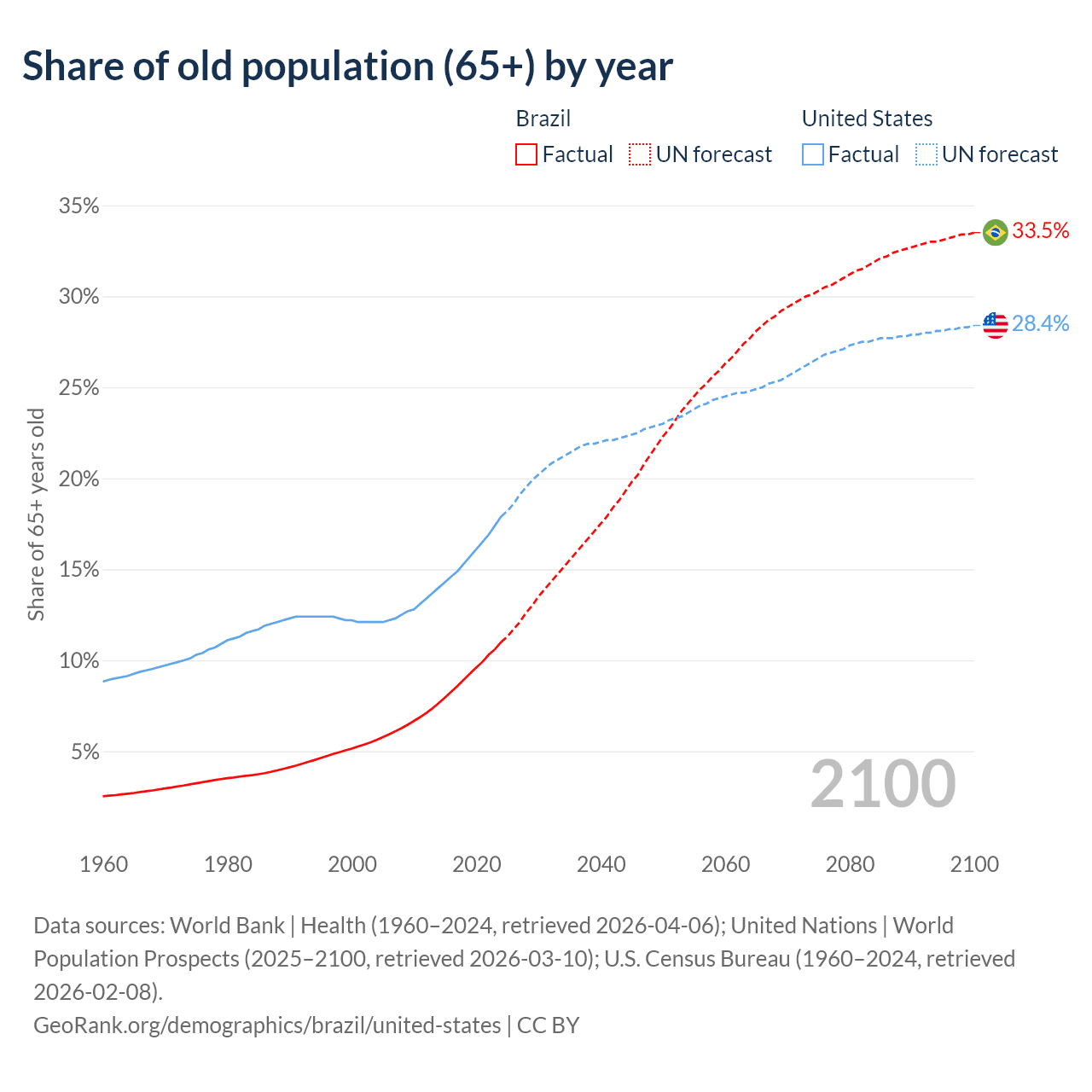 The share of older people aged 65 and over is 11% in Brazil and 17.9% in the United States. Life expectancy in Brazil compared to the United States .