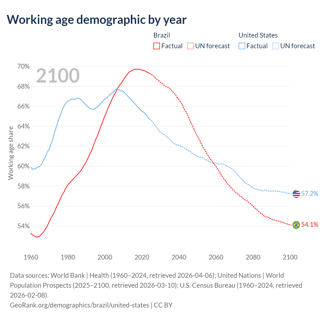 - Brazil has 148M working age adults (aged 15-64) vs 223M in the United States.