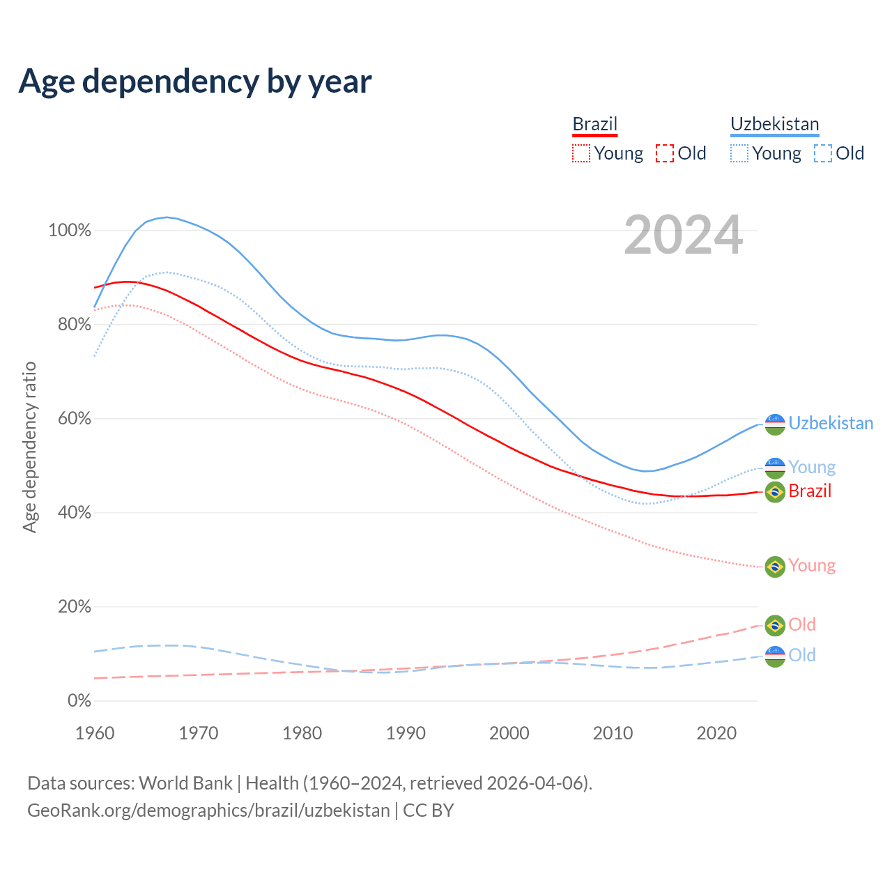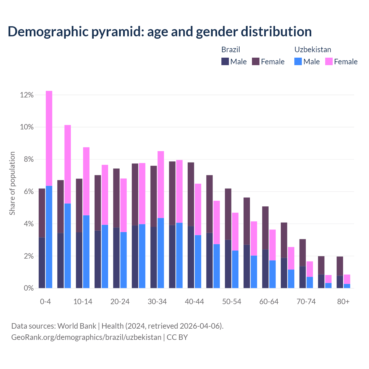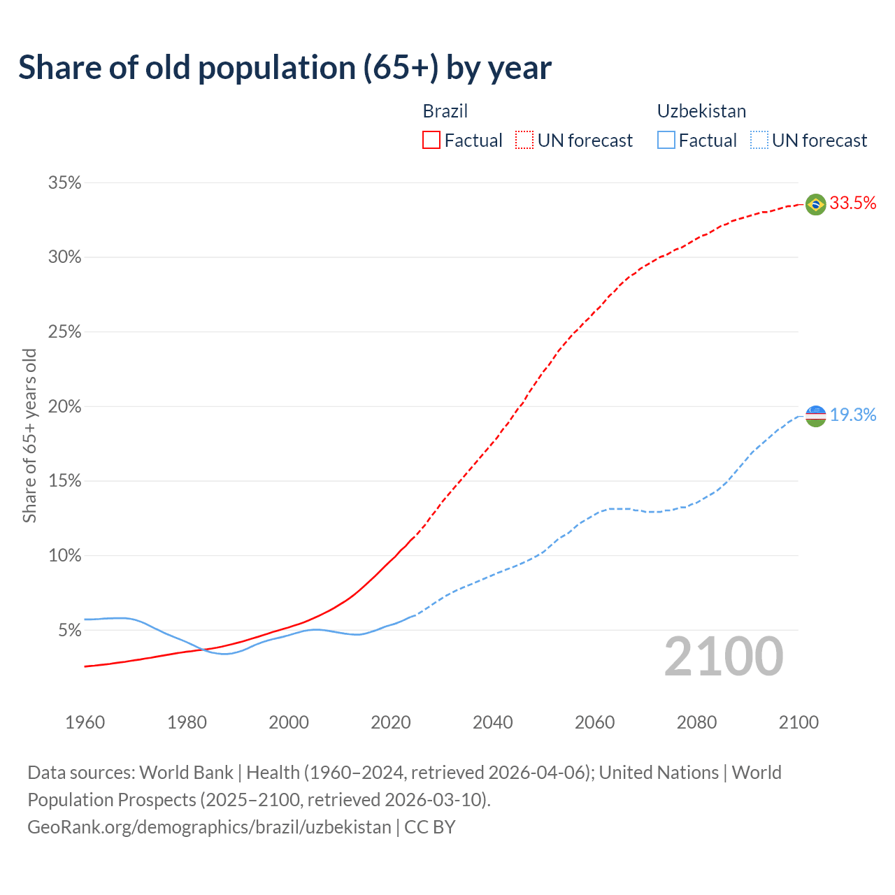 The share of older people aged 65 and over is 11% in Brazil and 5.86% in Uzbekistan. Life expectancy in Brazil compared to Uzbekistan .