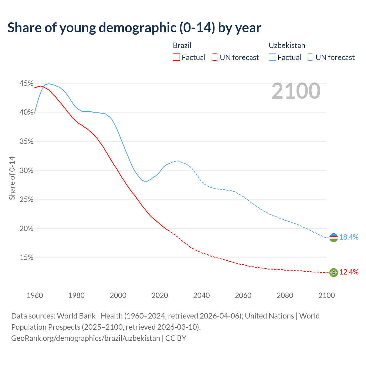 - The total fertility rate is 1.62 in Brazil compared to 3.5 in Uzbekistan.
