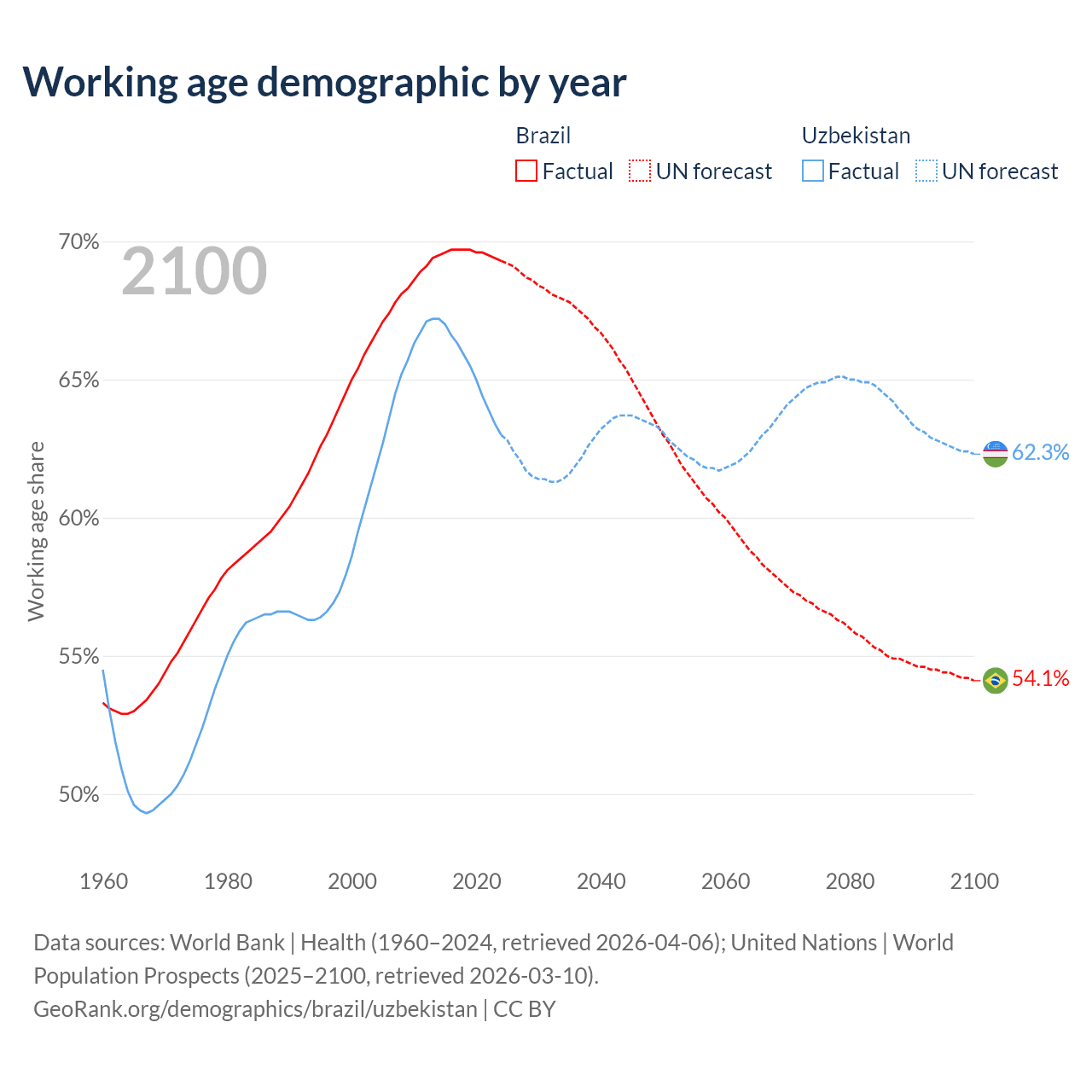 - Brazil has 148M working age adults (aged 15-64) vs 23.9M in Uzbekistan.