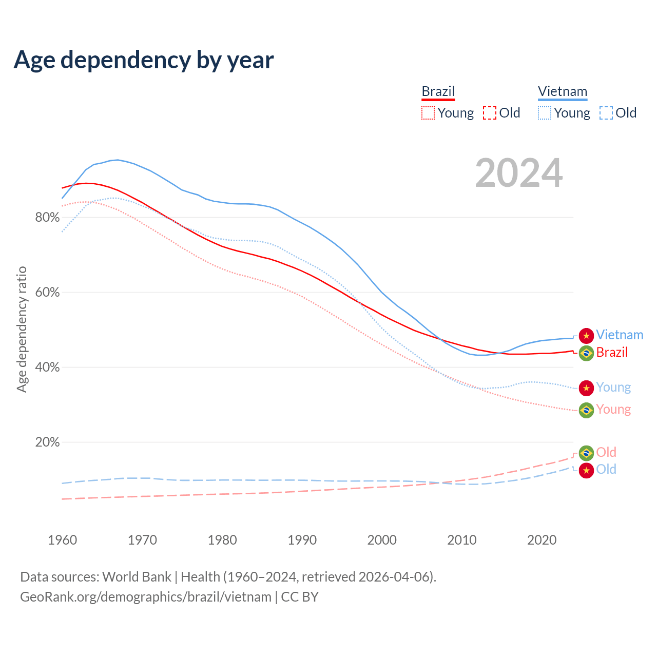 - The total fertility rate is 1.62 in Brazil compared to 1.91 in Vietnam.