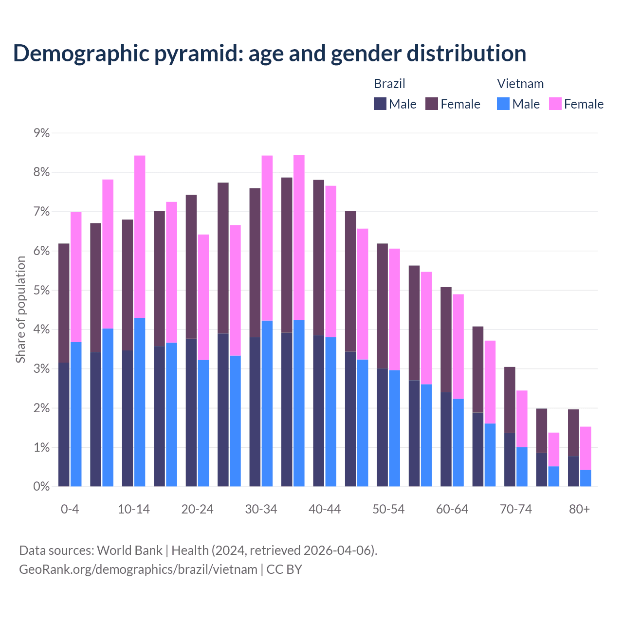 The share of older people aged 65 and over is 11% in Brazil and 9.05% in Vietnam. Life expectancy in Brazil compared to Vietnam .