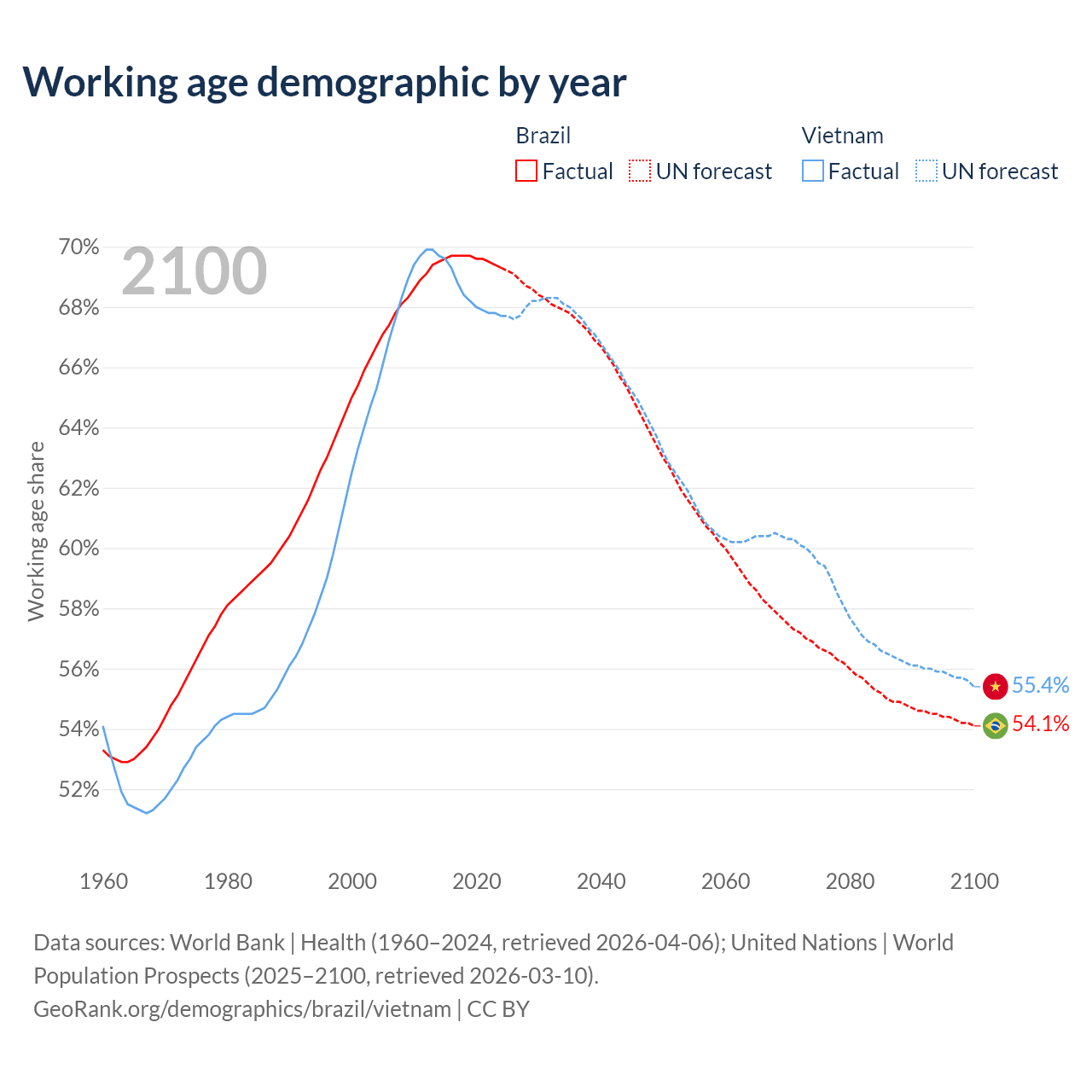 Median age Brazil vs Vietnam, 1960-2100