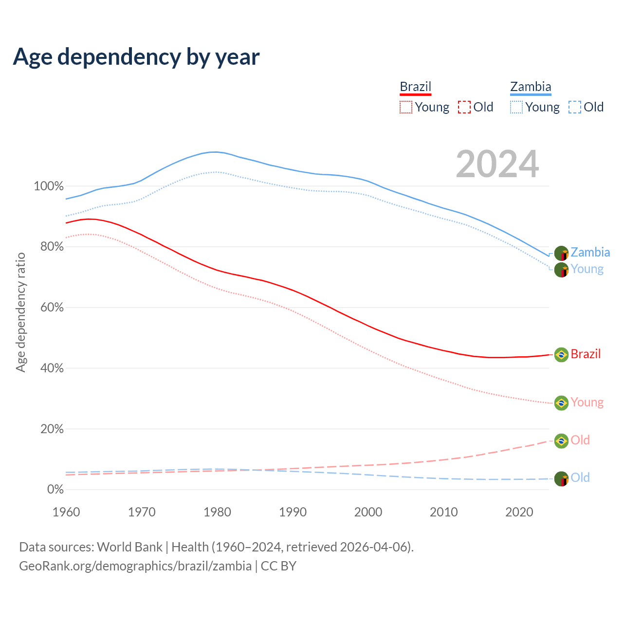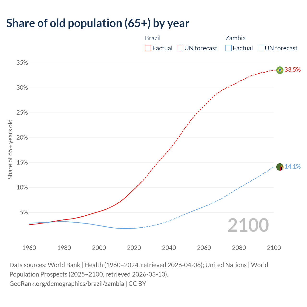 The share of older people aged 65 and over is 11% in Brazil and 1.95% in Zambia. Life expectancy in Brazil compared to Zambia .